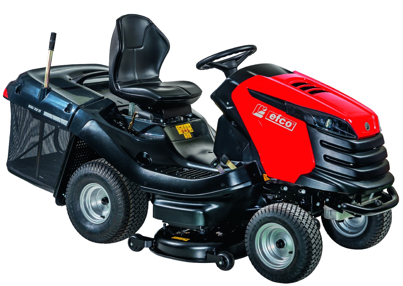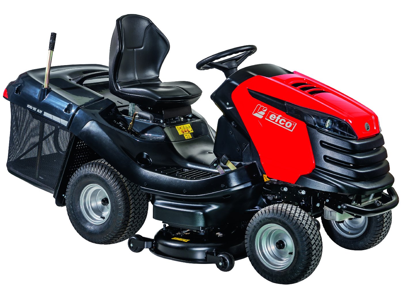 Rasentraktoren – die Robusten. Die Baureihe EF 106 hat folgende Merkmale: Hydrostat, Mähwerkzuschaltung elektromagnetisch, Mähwerkabschaltung bei vollem Fangkorb (akustisches Signal), Fangkorb vom Sitz aus zu entleeren, 4 Tastrollen am Mähwerk, Wasseranschluß zur Mähwerksreinigung, Schnitthöhe bequem vom Fahrersitz aus verstellbar, verstellbarer Sitz mit integriertem Sicherheitsschalter, Frontbeleuchtung, 2-Messersystem, Tankinhalt 8 l, Betriebsstundenzähler und Stoßstange.