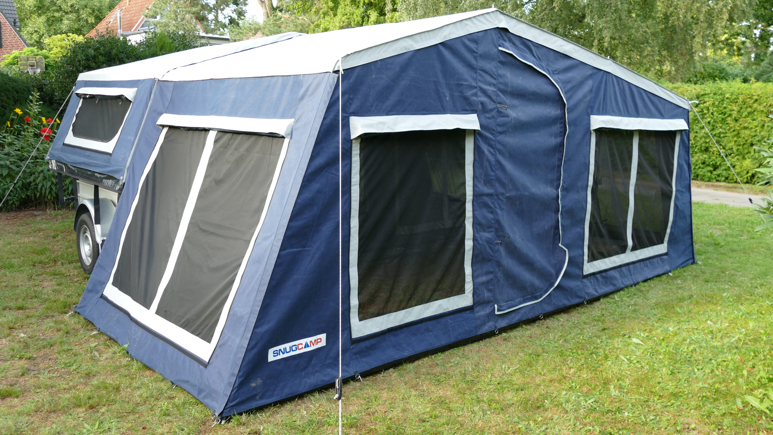 Außerdem werden die SNUGCAMP Zeltanhänger mit einem Vorzelt geliefert, welches bequem und schnell mit einem Reißverschluß und Klettverschluß am Hauptzelt angebracht werden kann. Das Vorzelt hat eine Größe von 10,68 qm, siehe auch Bild Zeltanhänger in grau. An warmen Tagen kann man das Vorzelt als reines Sonnendach nutzen, bei Bedarf kann man die Seitenteile einhängen sowie den Boden per Klettverschluß einsetzen. Das Vorzelt hat die gleichen Materialeigenschaften wie das Hauptzelt. Der Aufbau den Vorzeltes geht mit ein wenig Übung schnell von der Hand, der Abbau des Vorzeltes als auch des Hauptzeltes geht noch schneller.
