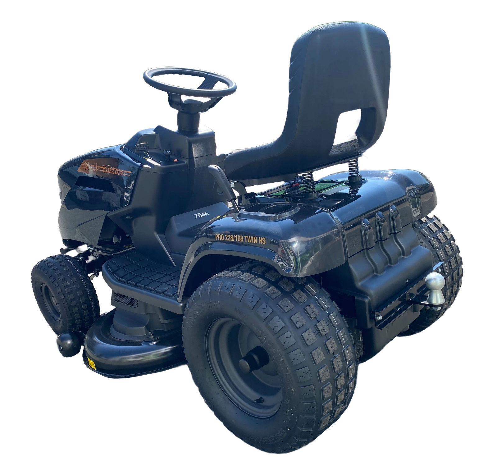 Der neue Rasentraktor Black Edition Pro 228/108 HS mit einer Schnittbreite von 108cm Seitauswurf mit Mulchmähwerk hat einem STIGA 2 Zylinder Motor mit satten 552 ccm Hubraum / 20 HP. Sein Hydrostat Getriebe lässt sich sehr leicht über das Fußpedal dosieren. Komfort Sitz sowie verstärkte Stahl Vorderachse sind in der Serie Black Edition PRO standard.