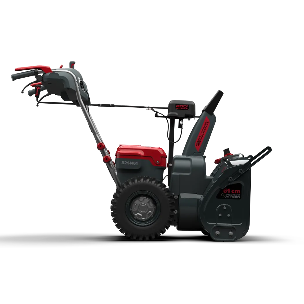 Die 82SN61 ist mit einem zweistufigen Wurfsystem mit gehärtetem Stahllaufrad ausgestattet, das den Schnee in den vorderen Teil der Maschine zieht, und die hocheffiziente Schnecke wirft den gesammelten Schnee über den Auswurfschacht aus. Dank der verschiedenen Drehzahlen kann bis zu einem halben Meter tiefer Schnee mühelos auf eine Entfernung von 15 m geworfen werden, was eine hohe Produktivität unter allen Bedingungen ermöglicht. Die Schneefräse ist dank der zwei unabhängigen Radnabenmotoren, die über zwei Handhebel gesteuert werden, sehr einfach und flexibel zu fahren.