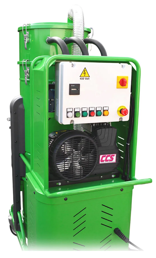 Vollautomatischer und wartungsarmer Hochleistungs-Staubsauger (5,5 kW / 400 V / 550 m³/h) mit integrierter Filterreinigungsautomatik mittels Druckluftkompressor für Dauereinsatz (24/7) ohne Unterbrechungen bei Großprojekten mit mittelgroßen und großen Bodenschleif- und Fräsmaschinen.