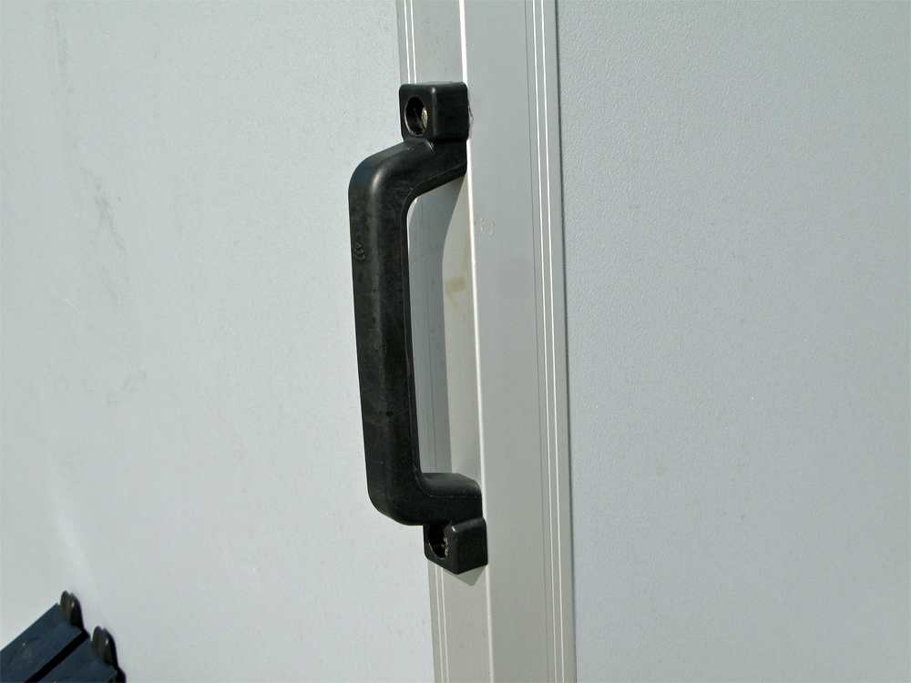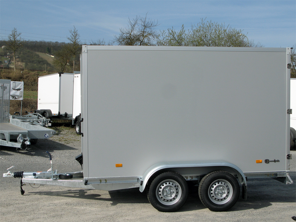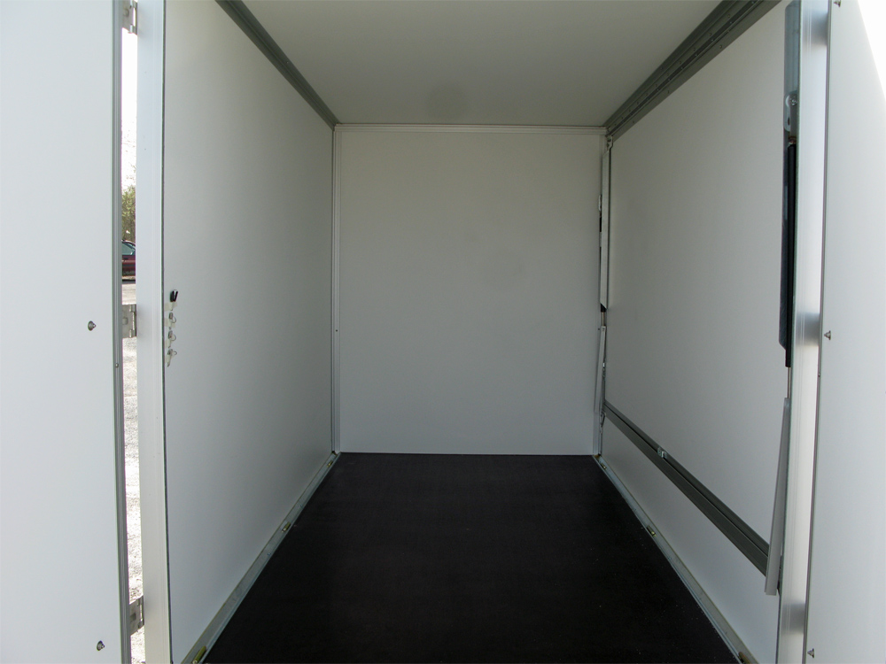 Tieflader-Koffer mit 2 Hecktüren und einer Seitenklappe rechts Multiplex-Wände mit Kunststoffbeschichtung Ladebodenhöhe: 52 cm Multiplex-Boden mit rutschhemmender Beschichtung Klappbares Stützrad V-Deichsel Innenbeleuchtung 2 Handgriffe an der Vorderseite 6 Anbinderinge