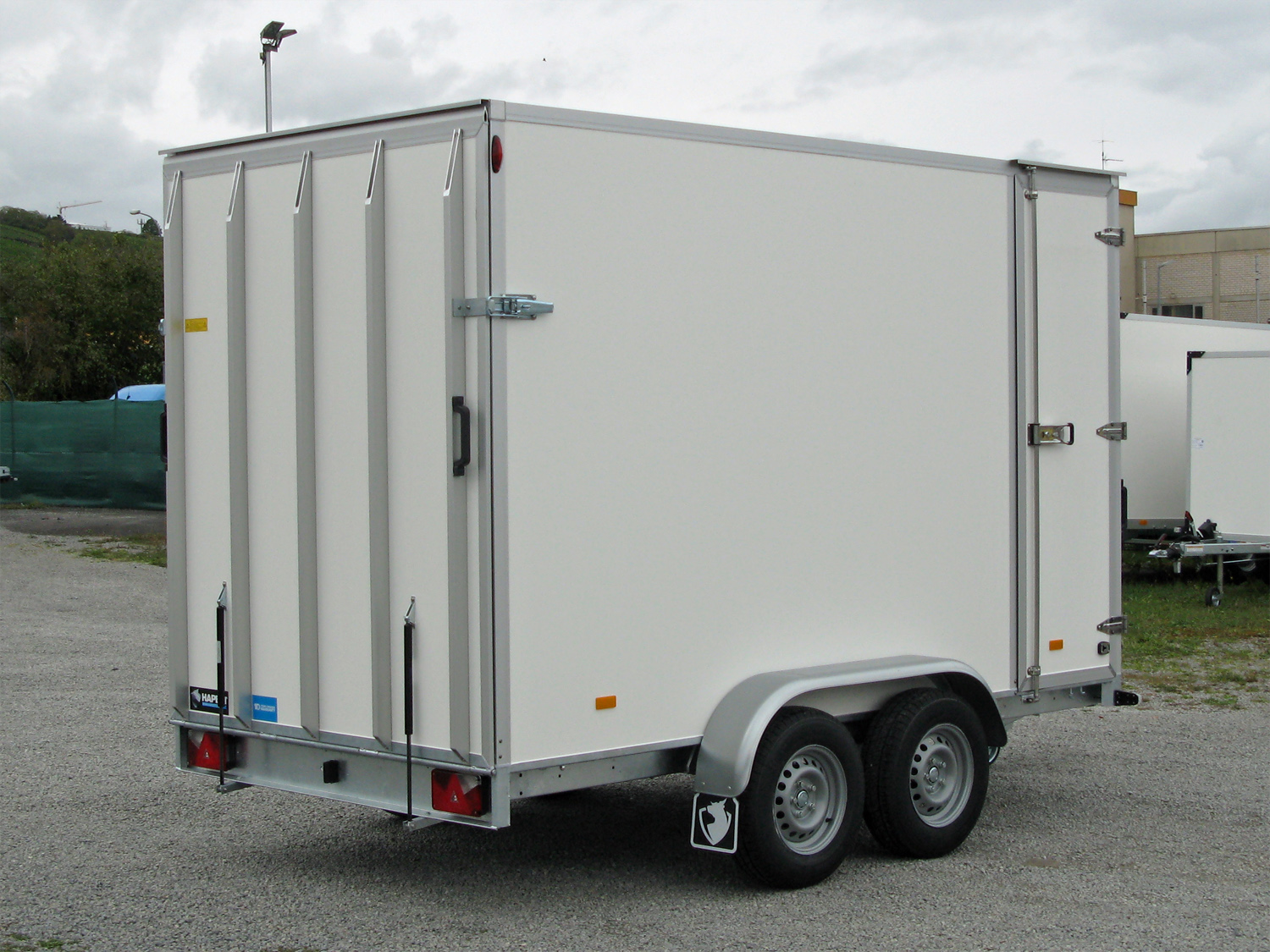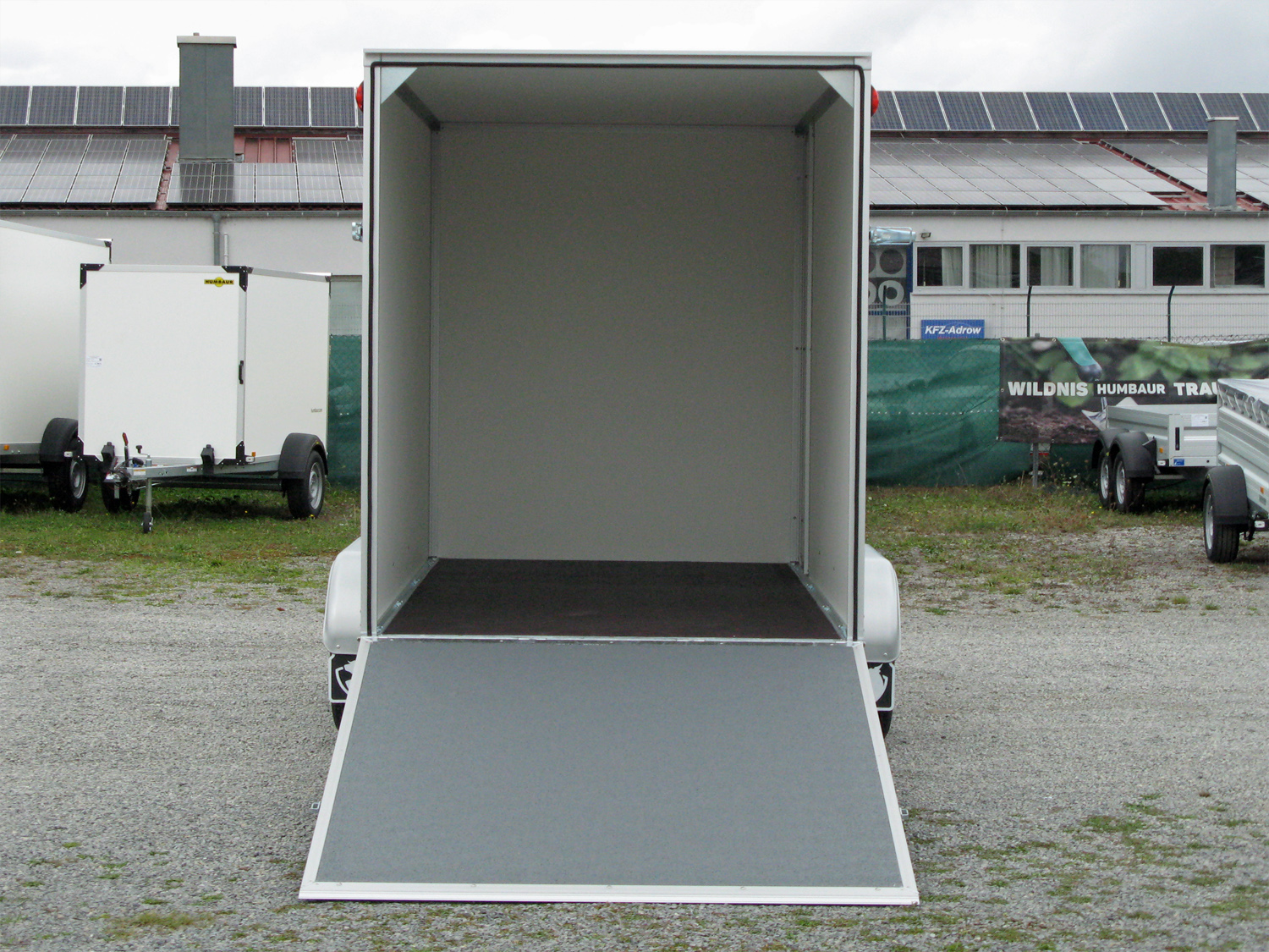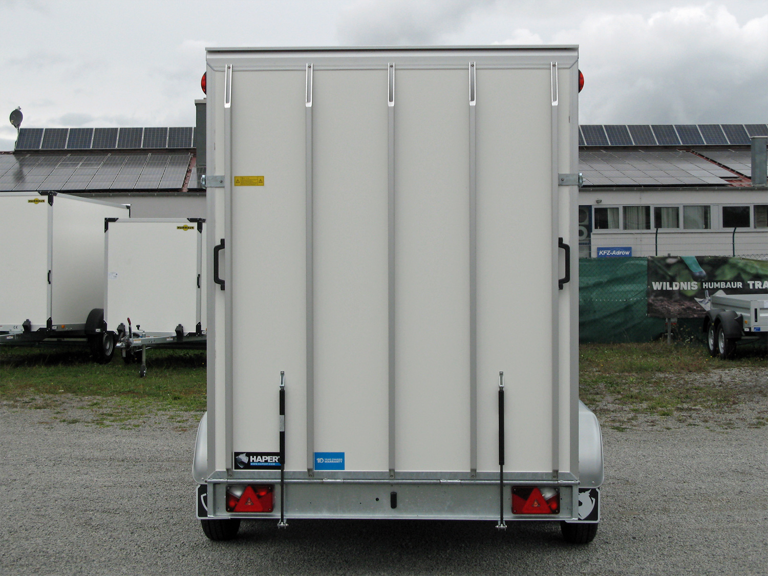Der Hapert Sapphire L-2 – 2700 ist ein robuster Tieflader-Kofferanhänger, ausgestattet mit einer rutschhemmenden Auffahrklappe mit Gasdruckfedern und einer Seitentüre vorne rechts für einfachen Zugang.