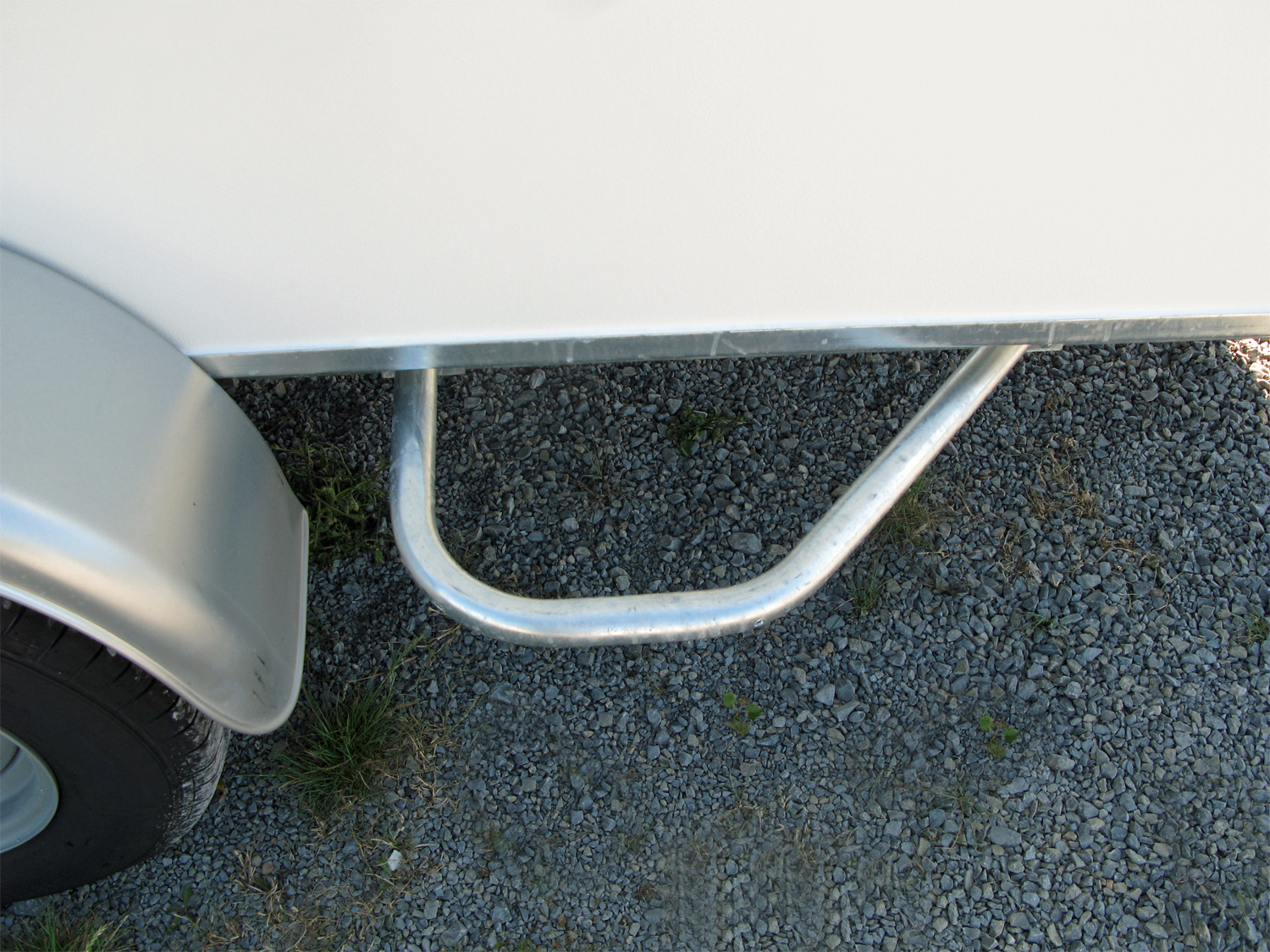 Das klappbare Automatik-Stützrad erleichtert das Manövrieren, und die V-Deichsel mit Metallkotflügel bietet optimale Stabilität. An der Vorderseite sind zwei Handgriffe integriert, um die Handhabung zu erleichtern.