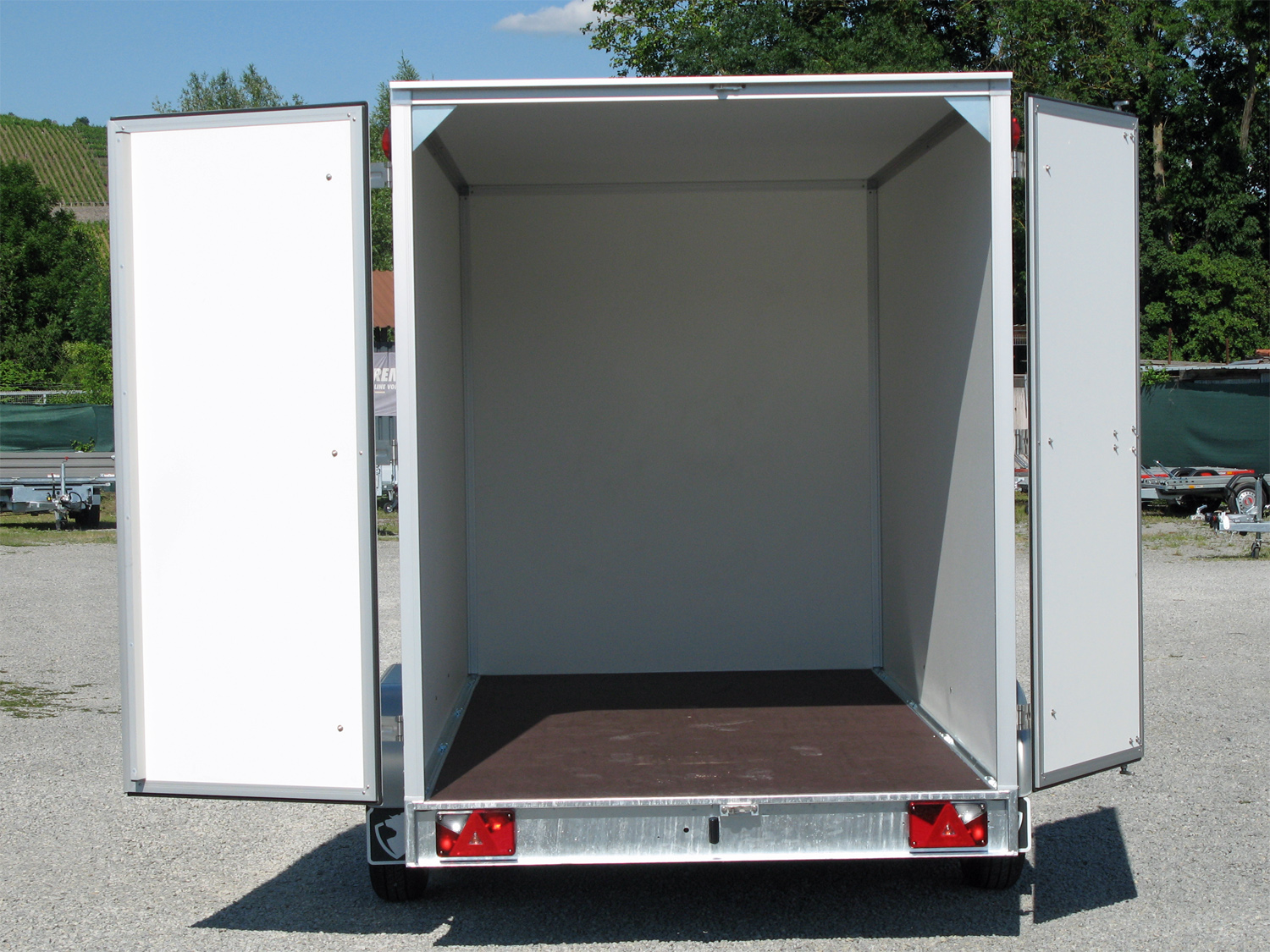 Der Hapert Sapphire L-2 – 3500 ist ein robuster Tieflader-Kofferanhänger, ausgestattet mit zwei stabilen Hecktüren für einen sicheren und komfortablen Zugang.