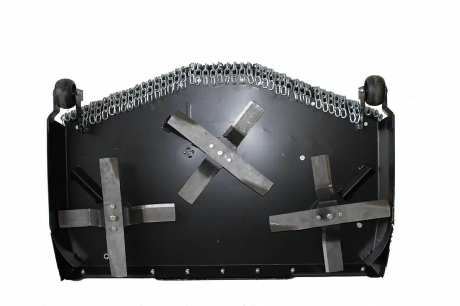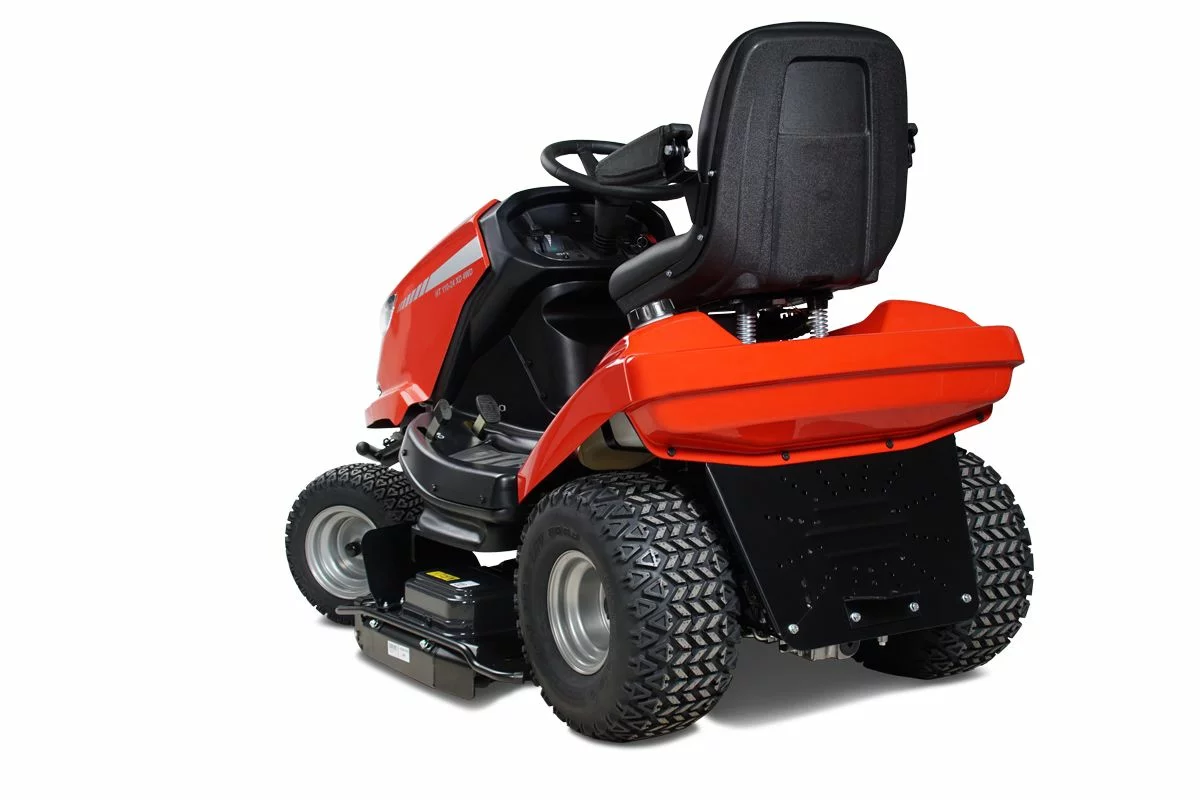 Das sehr stabil ausgelegte Mähwerk ist für die intensive Pflege bestens geeignet. Egal ob Hochgras oder regelmäßig gemähte Flächen, durch drei speziell geformte Kreuzmesser ist eine sehr gute Zerkleinerung und breitflächige Verteilung des Mähgutes gewährleistet. Durch die Konstruktion als Heckauswurfmähwerk wird die Steinschlaggefahr, wie man sie beim sonst üblichen Seitenauswurfdeck kennt, vermieden. Angeschweißte Deflektoren unter dem Mähdeck unterstützen zusätzlich die Zerkleinerung des Schnittgutes. Im Heckbereich eingesetzte Leitbleche garantieren eine sehr gute und gleichmäßige Verteilung des Schnittgutes.