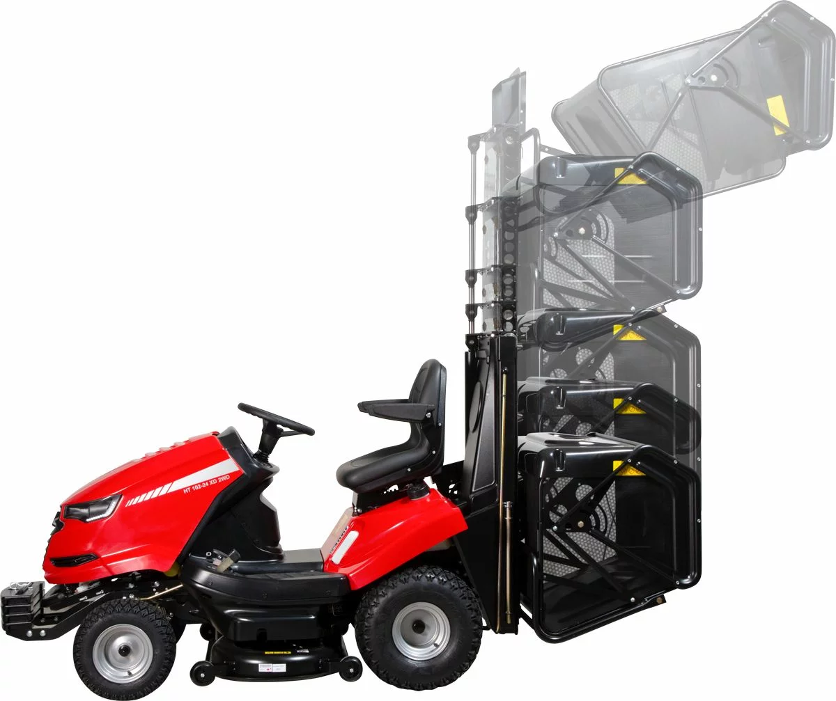 Riesiges Mähvolumen Das 102 cm breite Mähdeck mit 2-Messer-System sorgt für ein perfektes Schnittbild und enorme Flächenleistung. Darüber hinaus kann der Mähvorgang noch schneller abgeschlossen werden, da der große Fangkorb mit 400 Litern Fassungsvermögen seltener geleert werden muss. Einfach hoch hinaus Die Hochentleerung erreicht eine maximale Entladehöhe von 187 cm und entleert das aufgenommene Gras z.B. in einen Anhänger. Die Hebe- und Entleerfunktionen können durch zwei Kippschalter unabhängig voneinander gesteuert werden. Der Grasfangbehälter lässt sich in jeder Höhe öffnen, so das auch eine bodennahe Entleerung möglich ist. In nur 11 Sekunden ist er auf maximale Höhe ausgefahren und in die Entleerungsposition gekippt! Allradantrieb Das Modell HT 102 24XD 4WD ist mit Allradantrieb für beste Traktion ausgestattet. Die Herkules Rasentraktoren HT 102- 24XD 2WD/4WD HD mit der serienmäßig verbauten Hochentleerung sind optimal geeignet, wenn das Gras verladen und abtransportiert werden muss. Der 400 l Fangkorb kann bis zu einer Höhe von 187 cm angehoben werden. Eine Entleerung ist in jeder Höhe möglich.