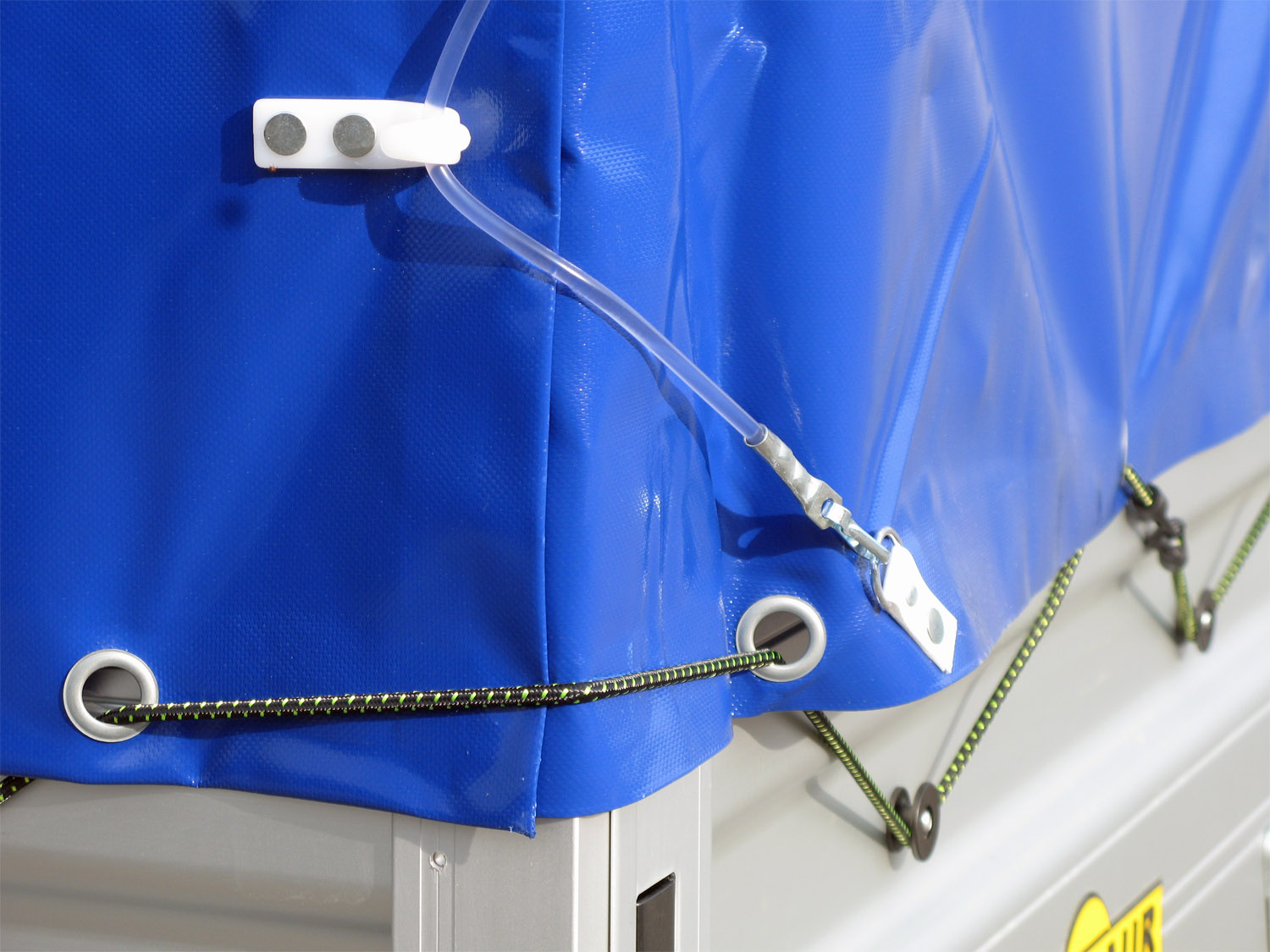 - Planenaufbau in Blau, alle Seiten lassen sich öffnen