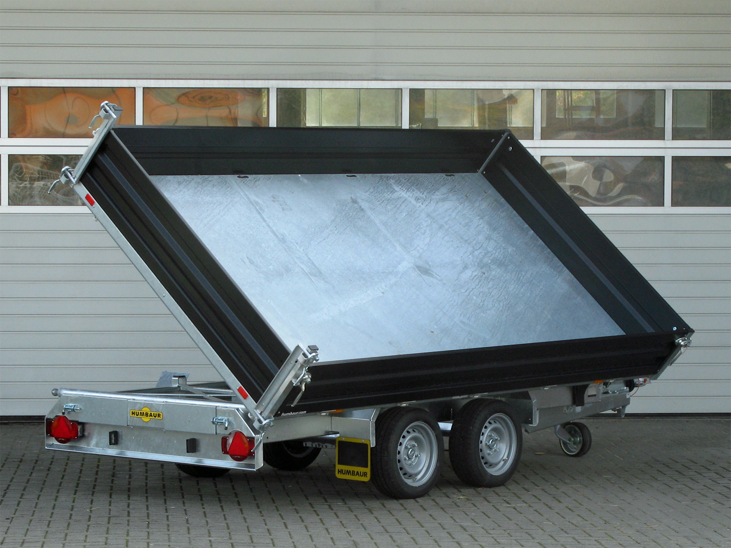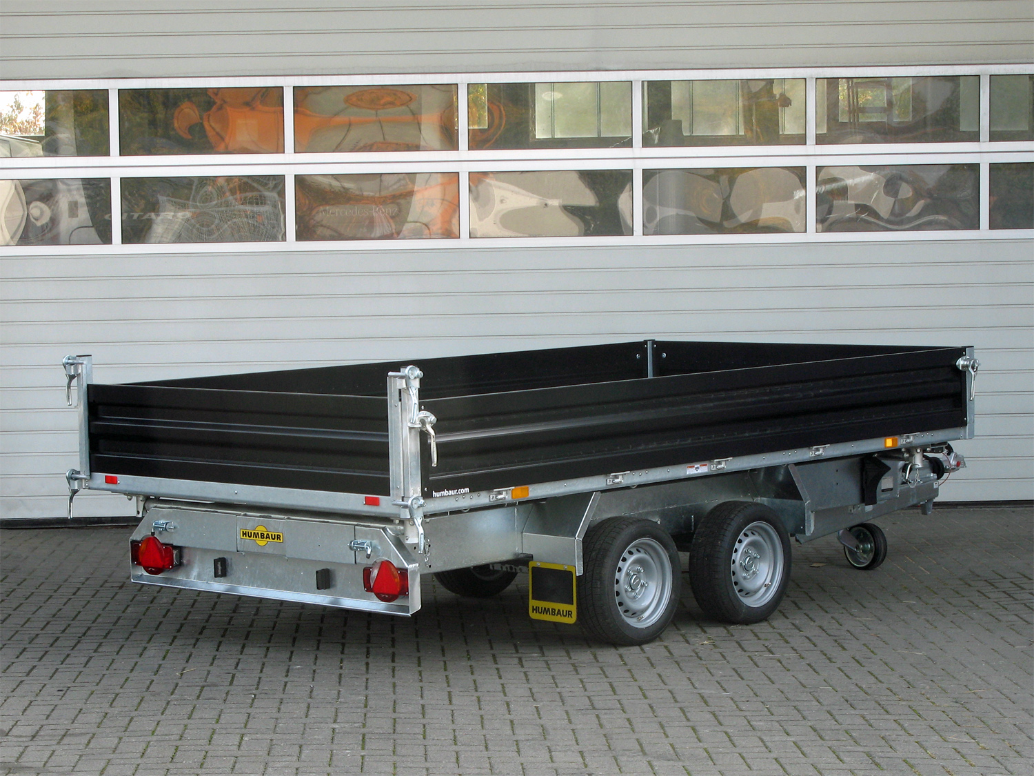 Der Humbaur HTK 3500.31 STAHL ist ein robuster Dreiseitenkipper mit einer Stahlbordwand, ausgestattet mit Rampen (2.650 mm lang im Schacht) und stabilen Stützen für vielseitige Einsätze. Sein tauchbadverzinktes Fahrwerk, der Rahmen und die aus einem Stück gefertigte Stahl-Kippbrücke garantieren maximale Haltbarkeit und Stabilität. Sechs im Brückenboden montierte Anbinderinge (je 800 kg Zugkraft) sorgen für eine zuverlässige Ladungssicherung, während die hintere Klappe pendelbar ist. Ein hochwertiger, hartverchromter 4-stufiger Qualitäts-Kippzylinder und eine leistungsstarke Hydraulikeinheit bieten eine zuverlässige Kippfunktion. Der vormontierte Bohlenschacht dient als Vorbereitung für Alubohlen. Das Modell ist mit einer Elektro- und Handpumpe ausgestattet, und der Kippwinkel beträgt ca. 45° nach hinten und seitlich.