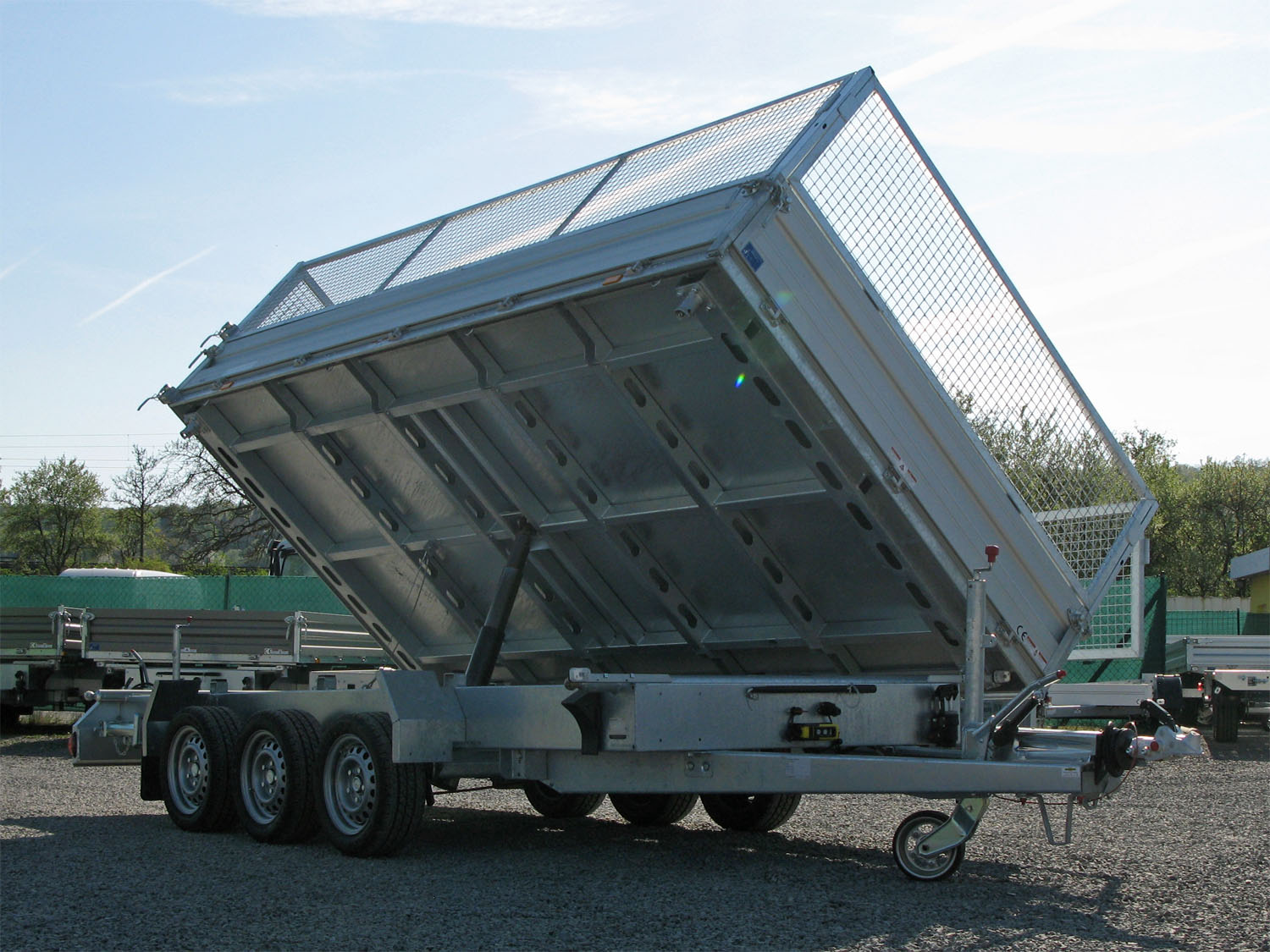 Der Humbaur HTK 3500.41 ALU Tridem ist ein leistungsstarker Dreiseitenkipper mit Aluminium-Bordwänden und einem robusten, tauchbadverzinkten Fahrwerk. Er ist mit drei Achsen und einer Bereifung von 195/50 R 13 C ausgestattet. Zu den Highlights gehören der 600 mm hohe Gitteraufsatz sowie die integrierten Rampen (2.650 mm lang) mit stabilen Stützen. Die Kippbrücke aus Stahl ist aus einem Stück gefertigt und gewährleistet maximale Haltbarkeit. Acht im Brückenboden montierte Anbinderinge (je 800 kg Zugkraft) sorgen für eine sichere Ladungssicherung. Der hochwertige 4-stufige, hartverchromte Kippzylinder und die Hydraulikeinheit bieten zuverlässige Funktionalität. Das Modell verfügt zudem über eine vormontierte Bohlenschacht-Vorbereitung für Alubohlen und ist mit Elektro- sowie Handpumpe verfügbar. Der Kippwinkel beträgt ca. 45° nach hinten und seitlich.