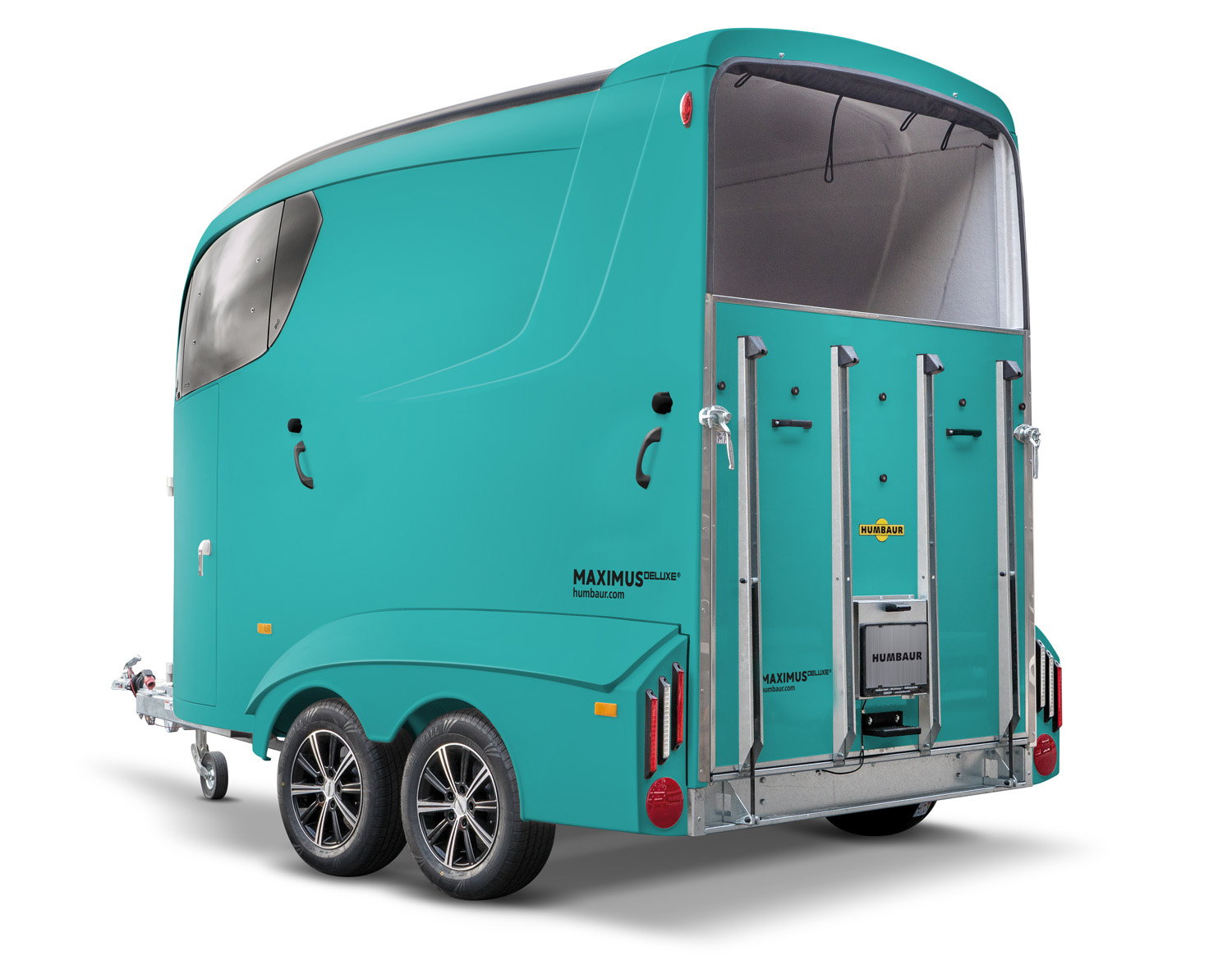 Der Humbaur Maximus DELUXE 2700 S bietet kompromisslose Vollausstattung und höchsten Komfort für Pferde und Besitzer. Mit aerodynamischen GFK-Kotflügeln, exklusiven Aluminiumfelgen und einem blendfrei getönten Panoramafenster ist dieses Modell die Luxusklasse unter den Pferdeanhängern. Die optimierte Innenraumgestaltung sorgt für maximalen Stauraum, während hochwertige Materialien und ausgefeilte Technik eine sichere und angenehme Fahrt garantieren.