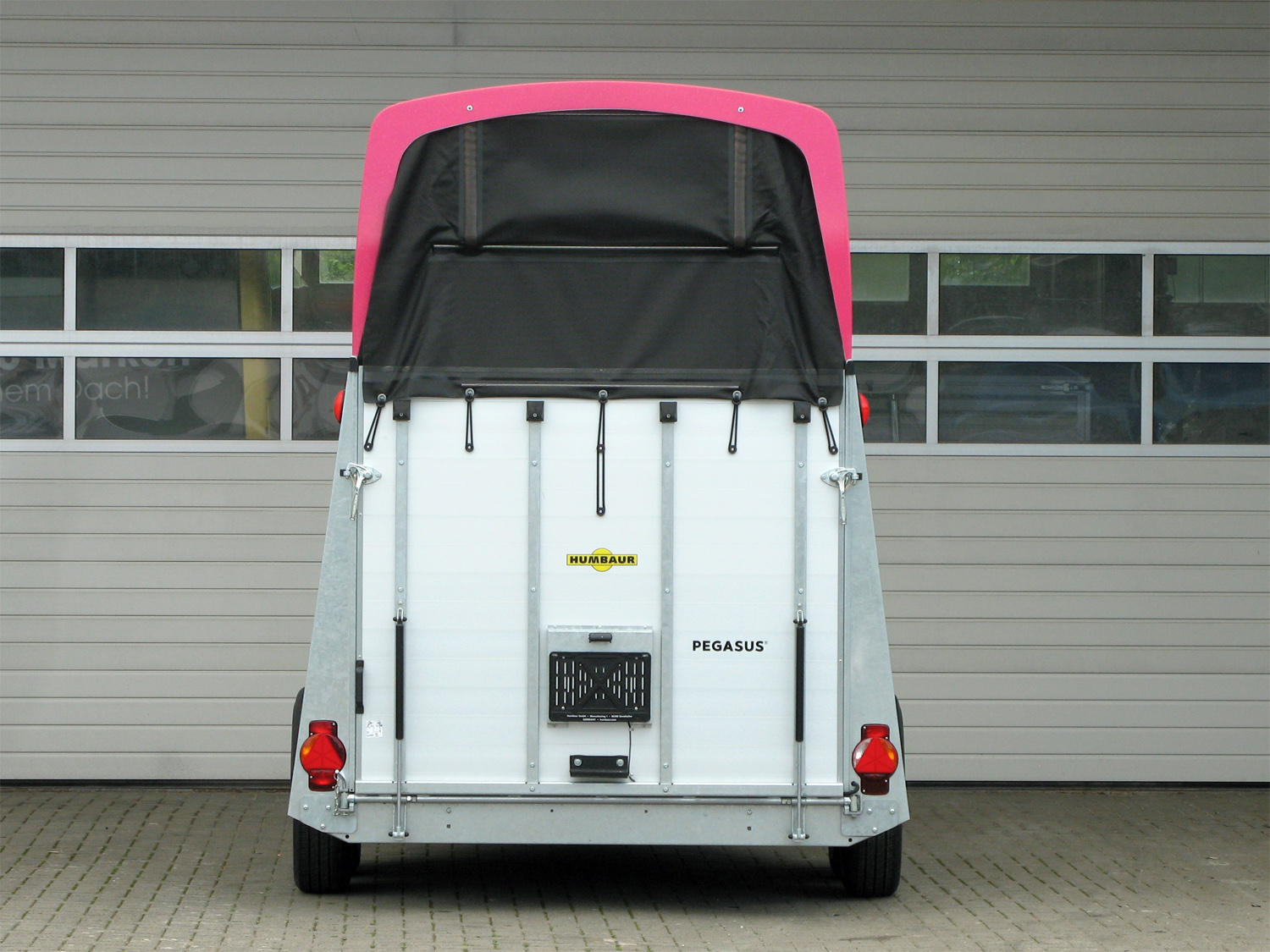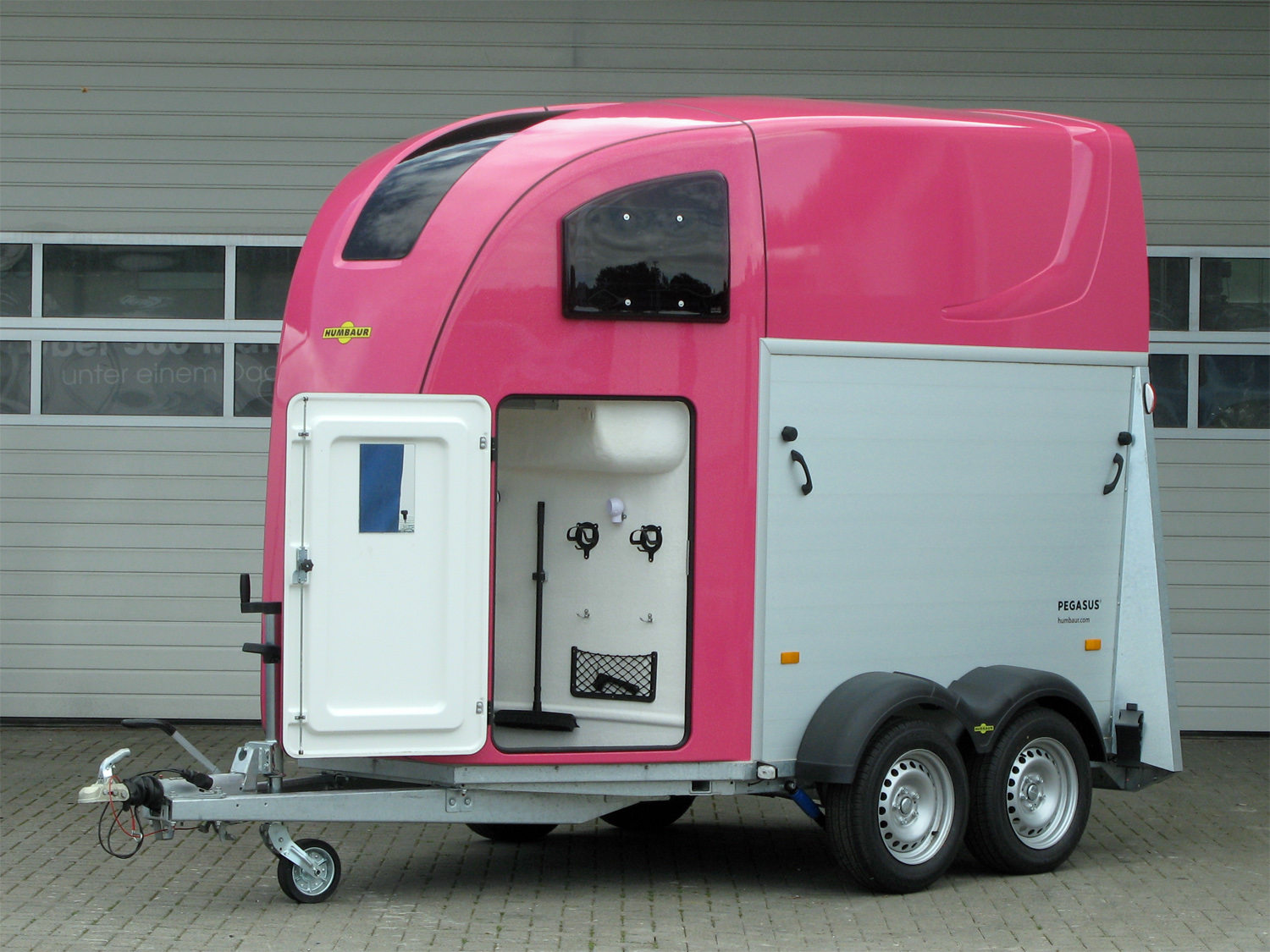 Der Humbaur Pegasus 2700 bietet eine innovative Ausstattung für einen komfortablen und stilvollen Pferdetransport. Die dreh- und schwenkbare Hecktüre sowie das Panoramafenster in Magenta Metallic sorgen für eine moderne und praktische Nutzung. Dank des EquiDrive® PLUS Fahrwerks mit automatischer Nachstellung der Bremse und Radstoßdämpfern ist eine sichere Fahrt gewährleistet. Die Konstruktion aus doppelwandigen, eloxierten Aluminiumprofilen in Kombination mit einem umlaufenden, feuerverzinkten Rahmenprofil garantiert höchste Stabilität. Die großzügige abschließbare Sattelkammer ist mit ausziehbarem Sattelhalter, Trensenhalter, Spiegel, Netz, Innenbeleuchtung, Schaufel und Besen ausgestattet. Die mannshohe Einstiegstüre mit 3-Punkt-Verriegelung, die geteilten, gepolsterten und höhenverstellbaren Brust- und Heckstangen mit EquiGuard® Panikentriegelung, sowie das Windschott für zugfreie Innenraumbelüftung sorgen für einen komfortablen Transport. Weitere Features umfassen getönte, 5-fach verstellbare Ausstellfenster, Seitentrittschutz, sowie eine Polyhaube in Magenta Metallic, die das elegante Design abrundet.