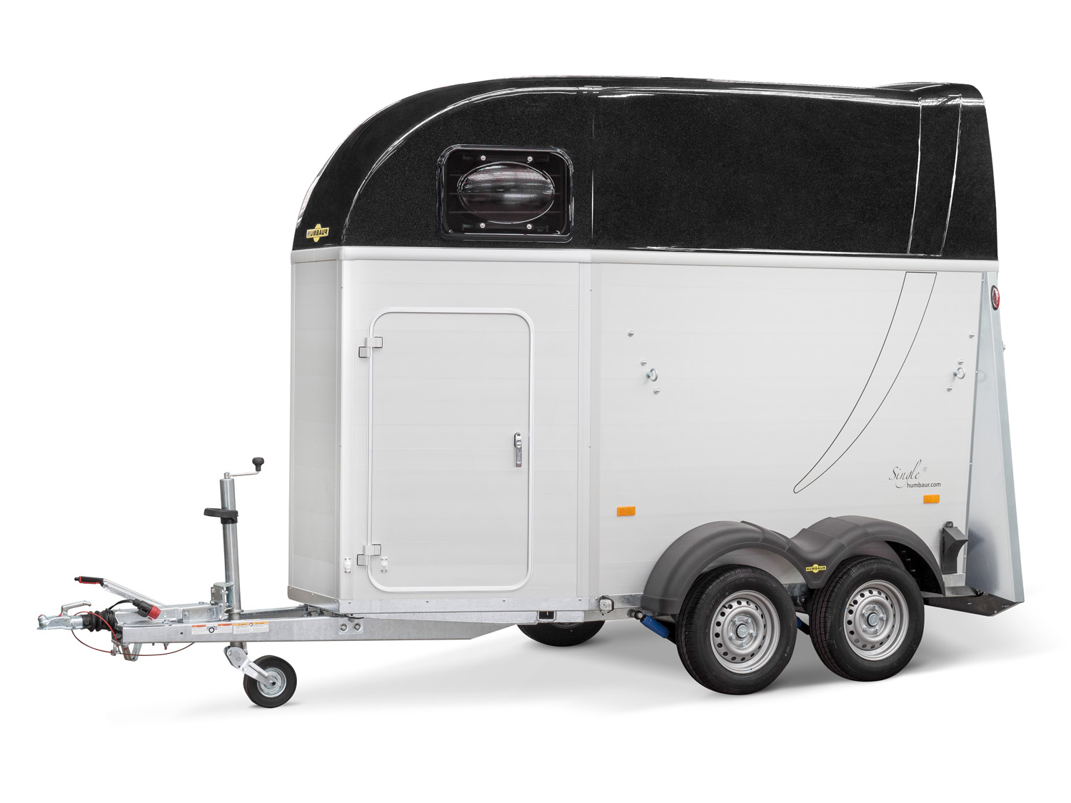 Der Humbaur Single Alu 1600 ist ein hochwertiger Pferdeanhänger mit kompaktem Design, ideal für den Transport von Stute und Fohlen. Dank des EquiDrive® Fahrwerks und der optionalen 100 km/h Zulassung (nur in Deutschland) bietet der Anhänger eine ruhige und sichere Fahrt. Die Konstruktion aus hochwertigen eloxierten Aluminiumprofilen (18 mm stark) sowie das massive, umlaufende und feuerverzinkte Rahmenprofil sorgen für maximale Robustheit und Korrosionsschutz. Die Brust- und Heckstange sind durchgehend höhen- und längenverstellbar und mit Panikentriegelung ausgestattet. Das exklusive Windschott ermöglicht eine zugfreie Innenraumbelüftung, während die getönten Ausstellfenster in der Polyhaube, die Innenbeleuchtung, und der Seitentrittschutz für zusätzlichen Komfort sorgen. Mit der Einstiegstüre mit 3-Punkt-Verriegelung, der Auflaufklappe mit Gummigranulatmatte, sowie der Polyhaube in Grau bietet dieser Anhänger eine durchdachte und langlebige Ausstattung.