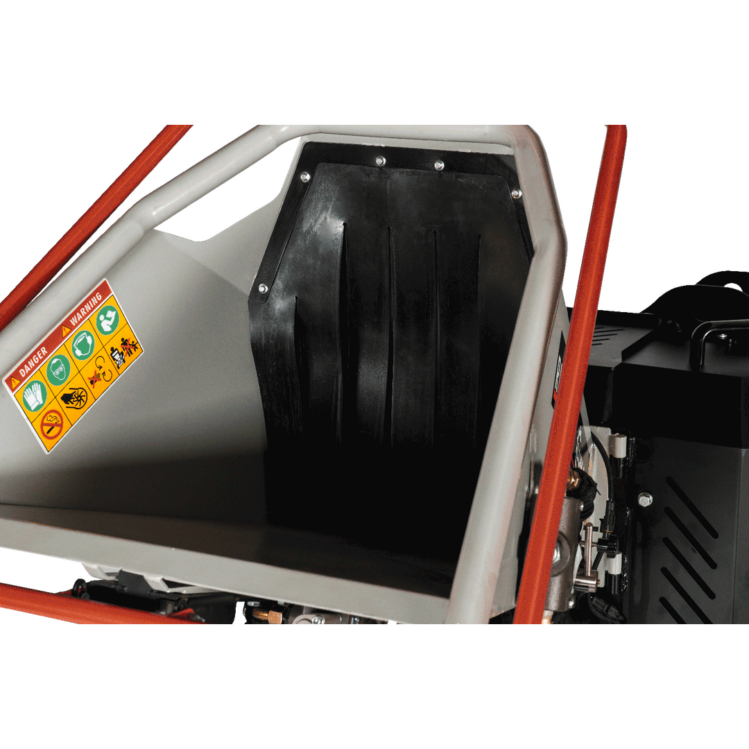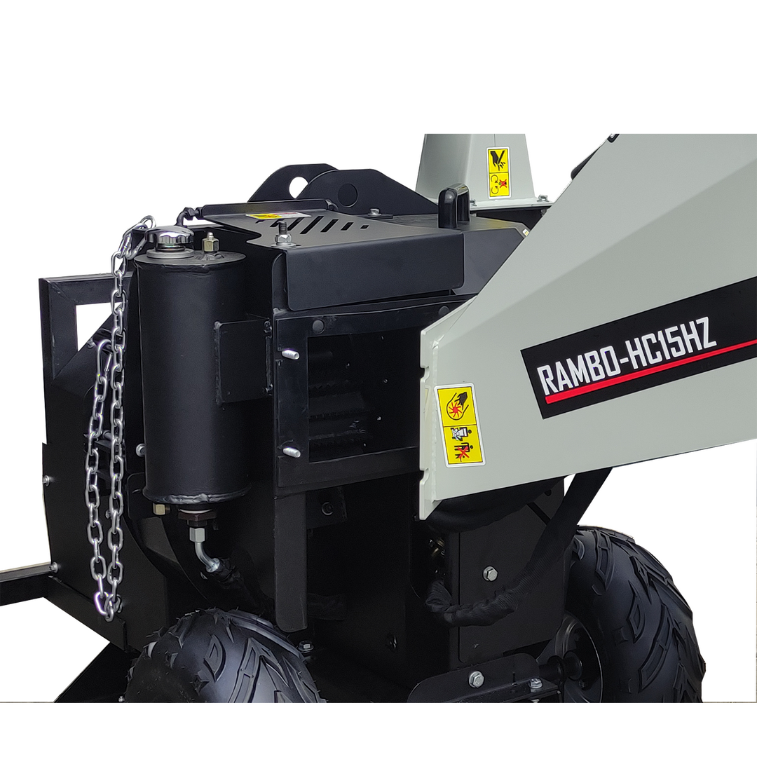 Der Lumag Rambo-HC15HZ Scheibenradhäcksler mit Zapfwellenantrieb ist der ideale Helfer für professionelle Arbeiten. Der robuste Häcksler zerkleinert mühelos Astwerk mit einem Durchmesser von bis zu 120 mm und verarbeitet auch widerspenstiges Material. Die hydraulische Einzugswalze mit Vor- und Rücklauf erleichtert das Arbeiten und sorgt für eine effiziente Verarbeitung des Schnittguts. Mit zwei Messern und einem Gegenmesser arbeitet der Häcksler zuverlässig und sorgt mit seinen 10 beweglichen Klingen auf dem Scheibenrad für einen feinen Auswurf. Das bereits gehäckselte Schnittgut wird nochmals zerkleinert, um einen noch feineren Auswurf zu erhalten. Die angebrachten 4 Flügel auf der Rückseite des Scheibenrades werfen das Schnittgut über den 360° drehbaren und 80 cm hohen Auswurfschacht aus. Ein weiteres praktisches Merkmal ist der Einfülltrichter sowie eine Wartungsklappe über der Einzugswalze, die für die Reinigung der Walze zur Seite geklappt werden kann.