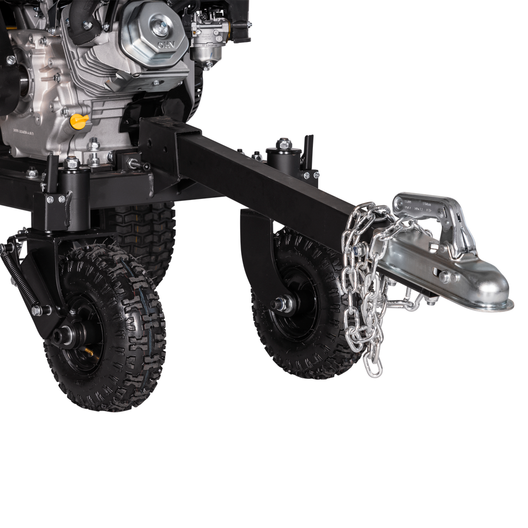 - Integriertes Fahrwerk mit abnehmbarer Deichsel für schnelles und einfaches Umsetzen auf privatem Gelände.