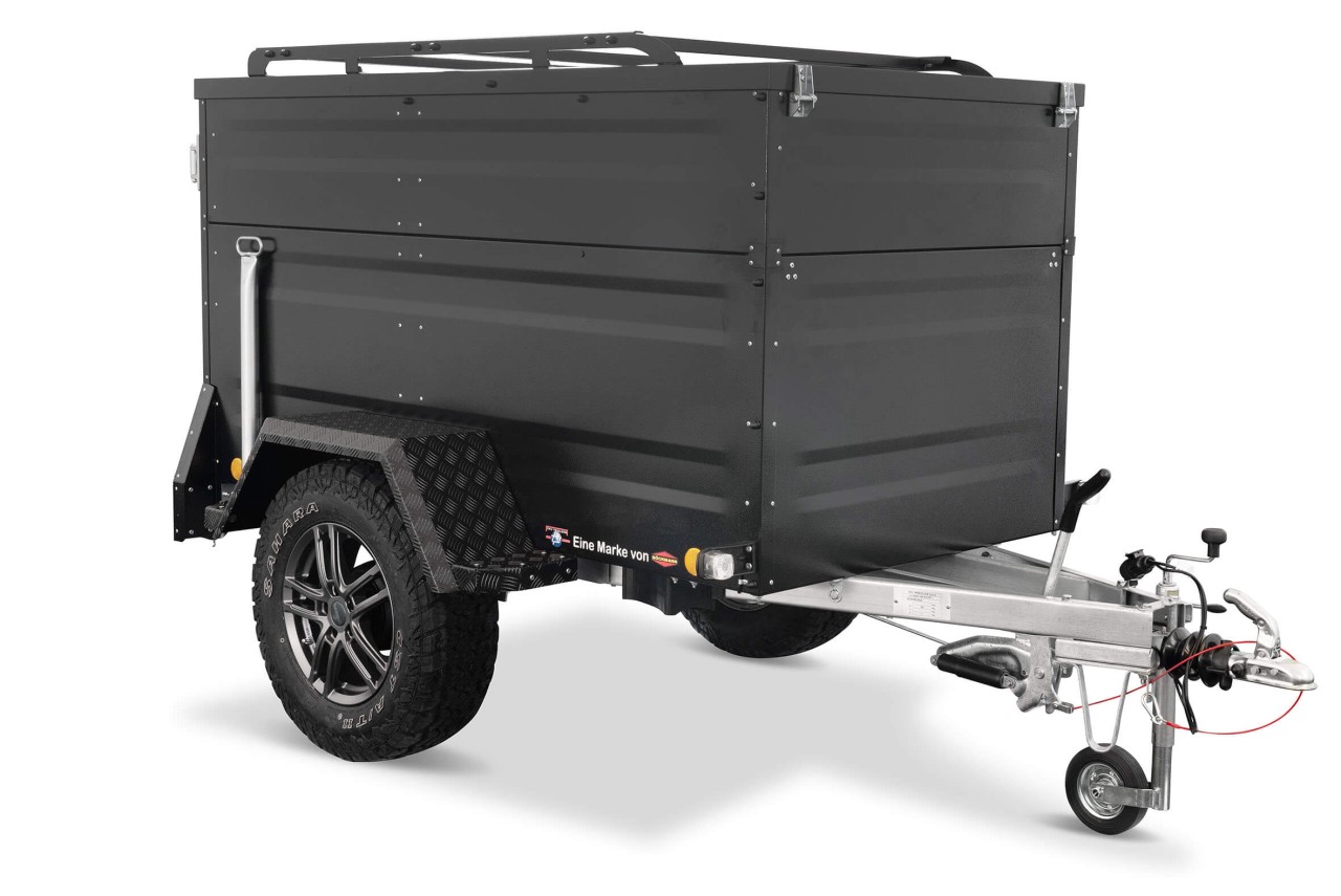 Dank der erhöhten Bordwand bietet der Anhänger eine Innenhöhe von über 1 m, sodass auch Fahrräder sicher transportiert werden können. Die grobstollige Offroadbereifung verleiht dem Anhänger zusätzliche Bodenfreiheit, während die verstärkten Kotflügel begehbar sind. Für den Einsatz eines Dachzelts können zwei zusätzliche Stoßdämpfer montiert werden, um die Deckeltraglast von 75 kg auf 250 kg zu erhöhen.