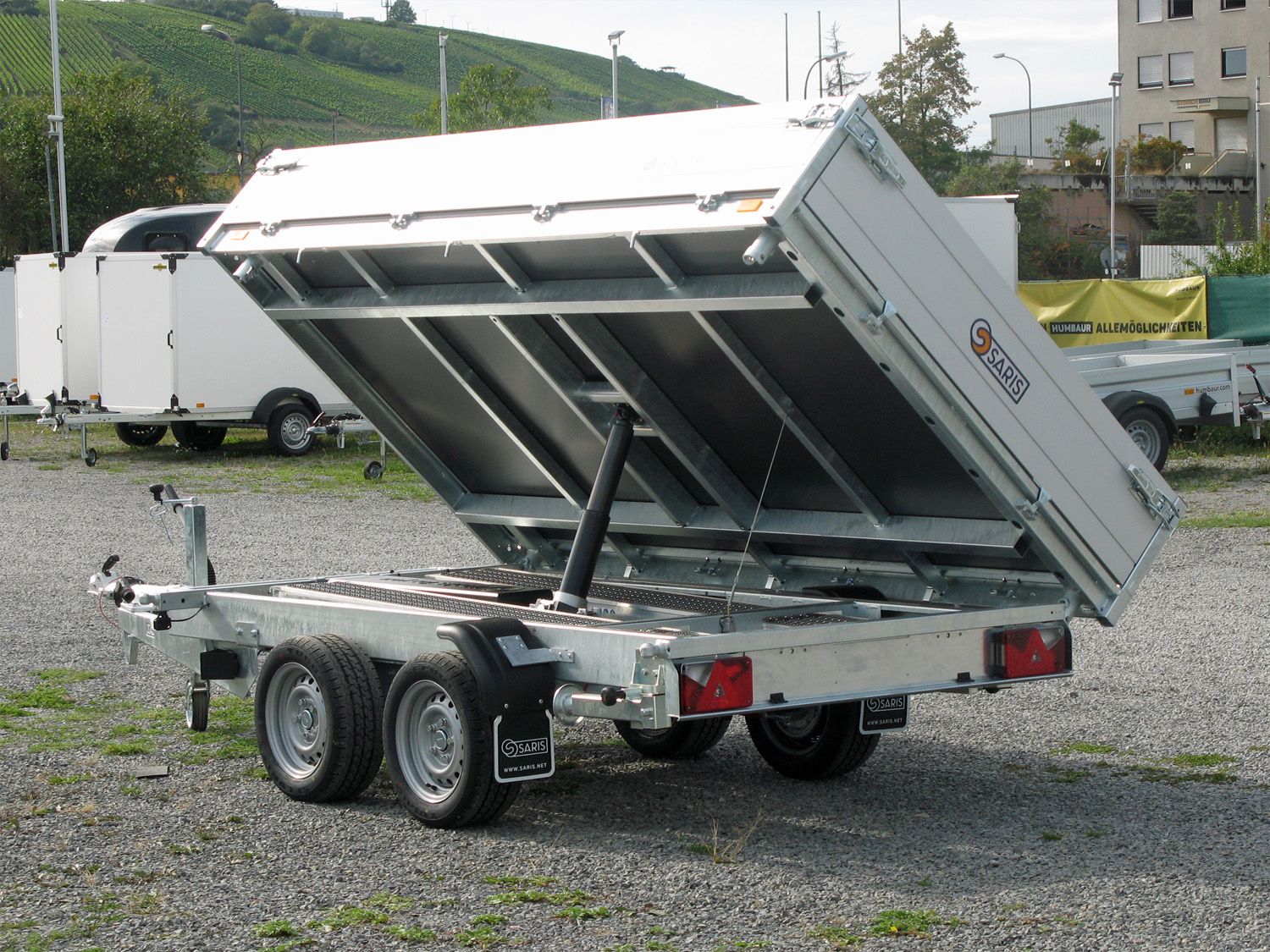 Der Saris K3 306 170 3500 2 E Profi ist ein professioneller Dreiseitenkipper mit elektrischer Bedienung, Rampen im Schacht und stabilen Stützen. Sein vollständig verschweißtes und feuerverzinktes Chassis gewährleistet maximale Stabilität und Langlebigkeit. Ausgestattet mit doppelwandigen Aluminium-Bordwänden (30 cm hoch) mit Spannverschlüssen, einem schweren Automatik-Stützrad und einer Stahlplatte auf Holzboden. Die Ladungssicherung wird durch acht geräuschhemmende Zurrbügel (800 daN) sowie sechs Seilhaken und Scharniere mit Netzhaken optimiert. Der Kippwinkel beträgt 42 Grad, ideal für effizientes Entladen.
