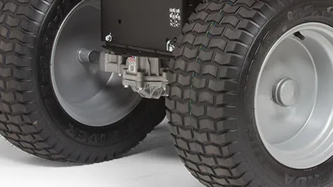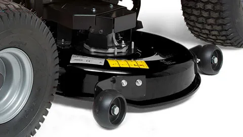 An allen vier Ecken des Mähwerkgehäuses sind strapazierbare Radstelzen als zusätzlicher Schutz angebracht. Die langlebige schwenkbare Vorderachse aus Gusseisen verleiht dem SPX Aufsitzmäher einen hervorragenden Wendekreis von 36 cm, sodass die Arbeit auch in komplexen Gärten einfach erledigt werden kann.