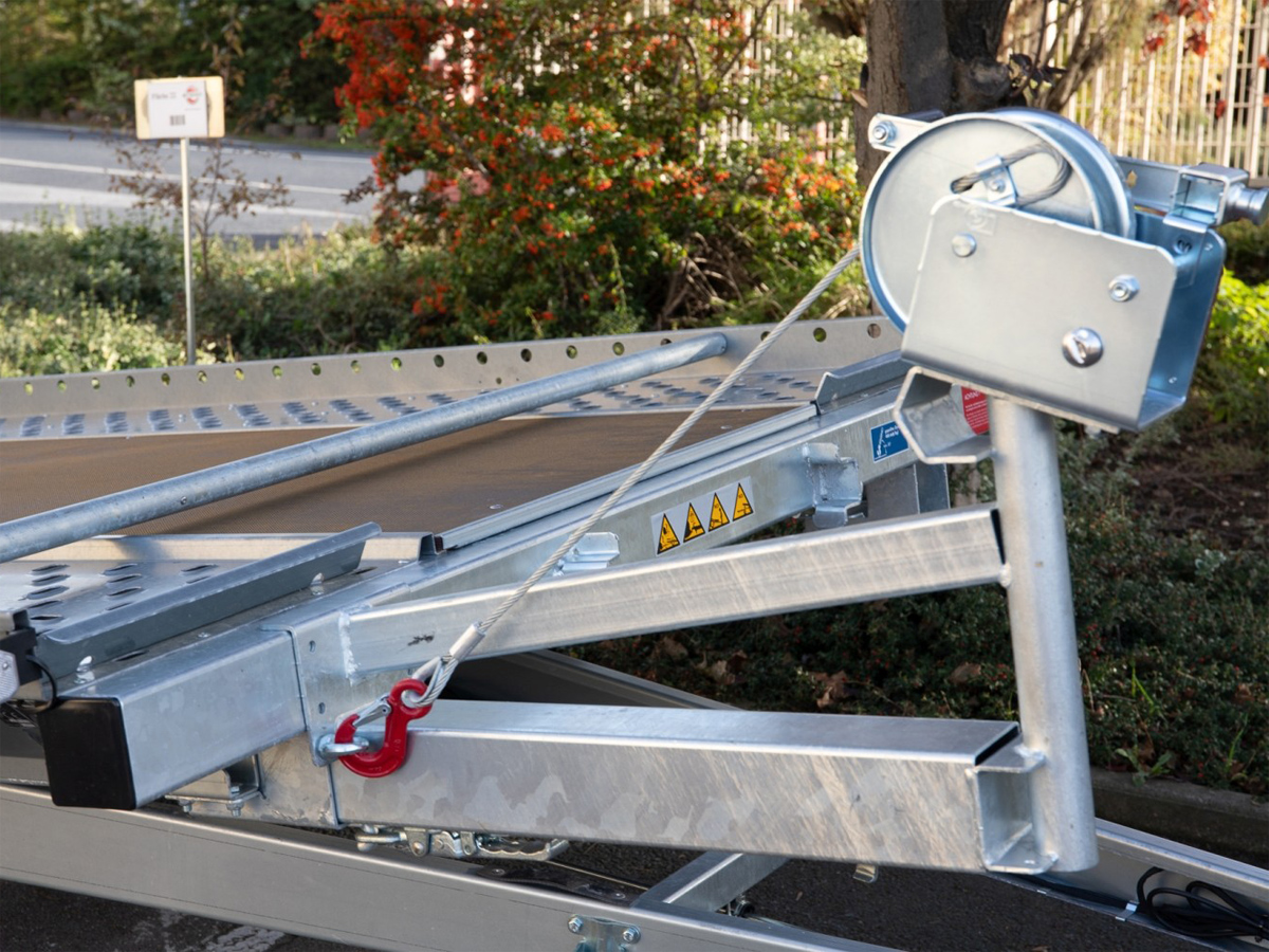 Dank der stufenlos mechanisch kippbaren Brücke kann das Fahrzeug direkt auffahren oder per Winde heraufgezogen werden. Das teststreckengeprüfte Fahrgestell mit Sicherheits-V-Deichsel sorgt für optimale Straßenlage.