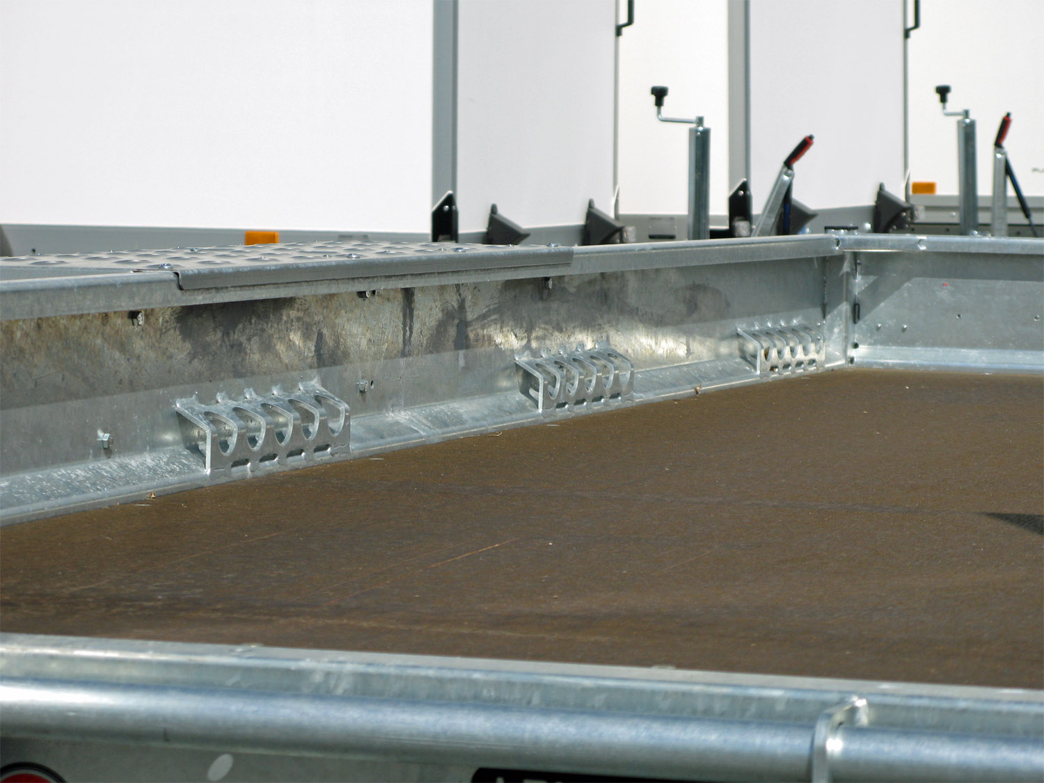 - 4 geschweißte Verzurrschienen mit je 1000 daN (geprüft nach DIN 75410-1) an den Seitenwänden