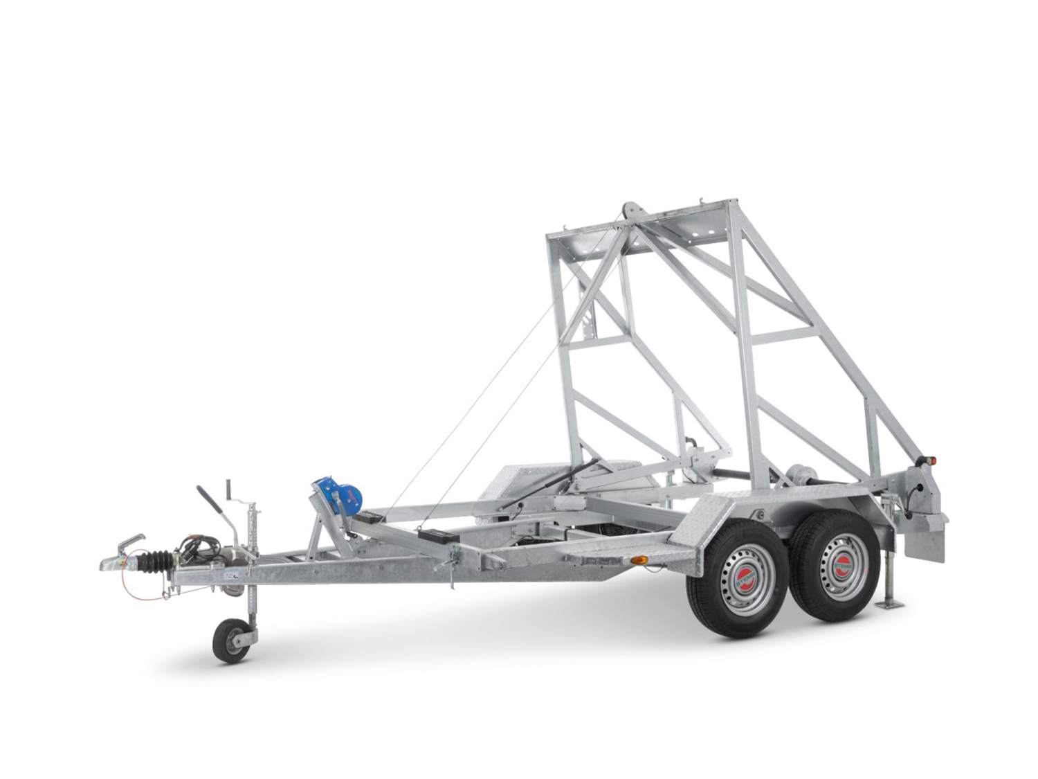 Der Stema KT O2 27-30-25.2 ist ein zuverlässiger Kabeltrommelanhänger mit moderner Multifunktionsbeleuchtung für optimale Sichtbarkeit. Er verfügt über einen Windenstand mit Seilwinde sowie montierte Unterlegkeile mit Halterung. Die begehbaren Stahlblech-Kotflügel erleichtern das Auf- und Absteigen. Das Fahrgestell besteht aus einer geschweißten und feuerverzinkten Rahmenkonstruktion mit V-Deichsel und Teleskopkurbelstützen für zusätzliche Stabilität. Die Kippbrücken sind aus massiven, geschweißten und feuerverzinkten Stahlprofilen gefertigt und sorgen für eine hohe Belastbarkeit. Ein Stützrad ist ebenfalls enthalten, um einen sicheren Stand zu gewährleisten.