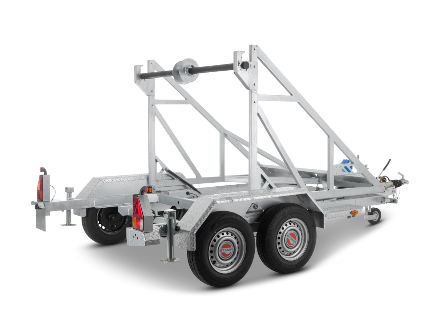 Der Stema KT O2 35-30-25.2 ist ein leistungsstarker Kabeltrommelanhänger mit moderner Multifunktionsbeleuchtung für optimale Sichtbarkeit. Er verfügt über einen Windenstand mit Seilwinde sowie montierte Unterlegkeile mit Halterung. Die begehbaren Stahlblech-Kotflügel erleichtern das Auf- und Absteigen. Das Fahrgestell besteht aus einer geschweißten und feuerverzinkten Rahmenkonstruktion mit V-Deichsel und Teleskopkurbelstützen für zusätzliche Stabilität. Die Kippbrücken sind aus massiven, geschweißten und feuerverzinkten Stahlprofilen gefertigt und sorgen für eine hohe Belastbarkeit. Ein Stützrad ist ebenfalls enthalten, um einen sicheren Stand zu gewährleisten.