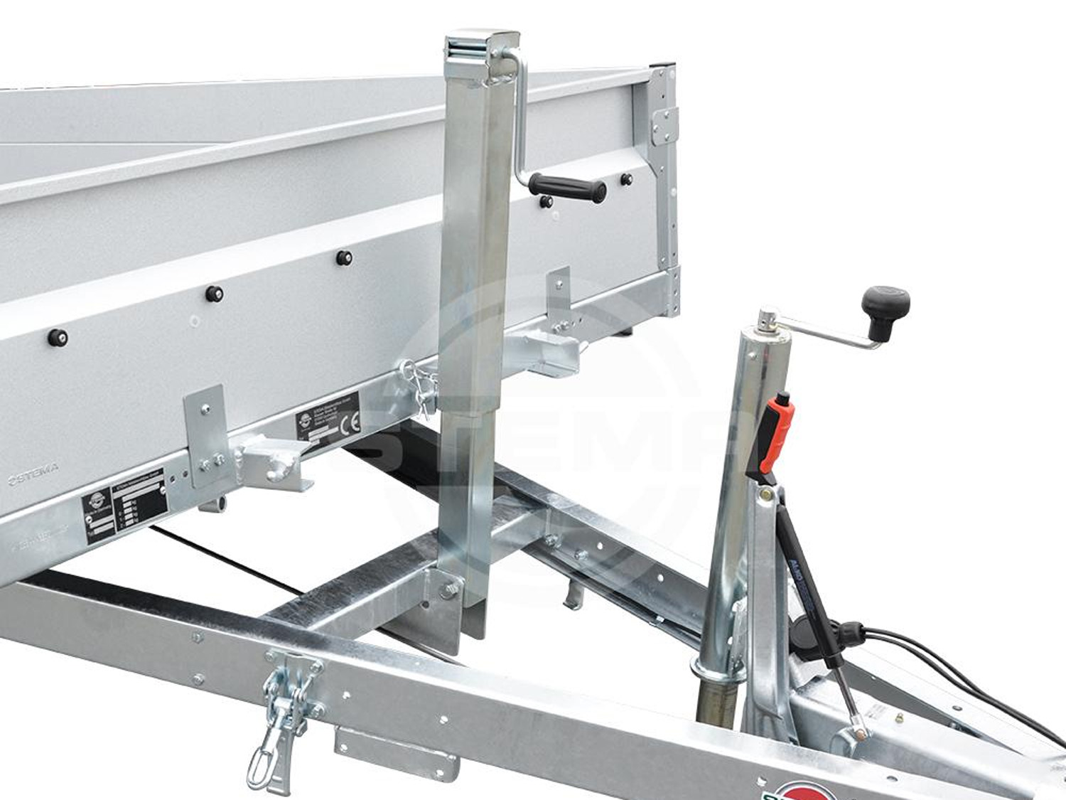Das feuerverzinkte Fahrgestell und die Kippbrücke gewährleisten eine lange Lebensdauer und eine optimale Straßenlage. Unterstützt wird dies durch die STEMA Sicherheits-V-Deichsel, eine robuste Gummifederachse mit Einzelradaufhängung sowie ein wartungsfreies Kompaktradlager.