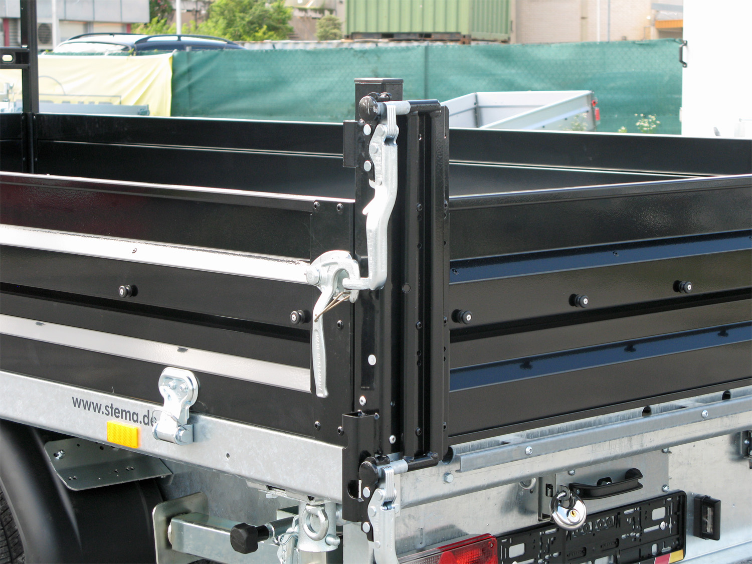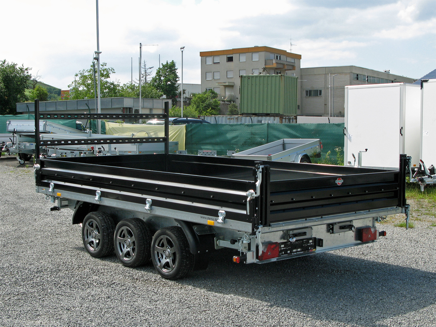 Der STEMA SHDK O2 35-40-20.3B TRIUS TRIDEM ist ein hochwertiger 3-Seiten-Kipper mit umfangreichem Zubehör. Er kommt mit Alufelgen, einem Auffahrpaket mit Aluminium-Auffahrschienen und Teleskopkurbelstützen sowie einem stabilen Leitergestell. Die Bordwände bestehen aus 2 mm starkem Stahlblech mit langlebigem Korrosionsschutz und robusten Winkelhebelverschlüssen. Die Rückwand ist pendelbar, und alle Bordwände sind abklapp- und abnehmbar. Das Fahrgestell ist teststreckengeprüft und mit einer STEMA Sicherheits-V-Deichsel ausgestattet. Der geschweißte und feuerverzinkte Rahmen sorgt für hohe Stabilität, ergänzt durch eine Zugkugelkupplung mit Sicherheitsanzeige und Kunststoff-Kratzschutz. Das hydraulische System umfasst einen hartverchromten 4-stufigen Hydraulikzylinder mit Elektro-Pumpe, Notpumpe und Begrenzungsventil. Eine stoßfeste 100Ah-Batterie mit Ladeanschluss und Fernbedienung stellt die Energieversorgung sicher. Die Ladefläche besteht aus 3 mm starkem verzinktem Stahlblech, mit Wartungsstütze für zusätzliche Sicherheit. Die moderne Beleuchtung umfasst Rückfahrscheinwerfer, Nebelschlussleuchte und Umrissleuchten. Zur Ladungssicherung sind 8 Schwerlast-Verzurrösen (je 800 daN, nach DIN 75410-1 geprüft) integriert sowie zusätzliche Verzurrhaken an den Querträgern und Ringmuttern an den Längsseiten.