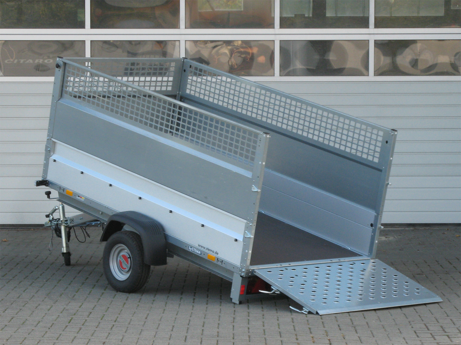 Ein zusätzliches Gitteraufsatz (66 cm Höhe) bietet erweiterten Schutz und sichert die Ladung effektiv. Der Anhänger ist mit einem Sicherungsspannverschluss für den Ladeboden, einem extra dicken, phenolharzbeschichteten Ladeboden für hohe Widerstandsfähigkeit sowie sechs stabilen, versenkbaren Verzurrösen ausgestattet.