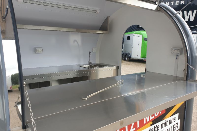 Der Foodtrailer besteht aus einem Gitterrohrrahmen mit Polyesterverkleidung und steht stabil auf 4 Heckstützen und einem Automatikstützrad. Das feuerverzinkte Stahlchassis sorgt für eine hohe Widerstandsfähigkeit, während die Zulässige Gesamtmasse von 1.350 kg eine großzügige Nutzlast von 770 kg ermöglicht.