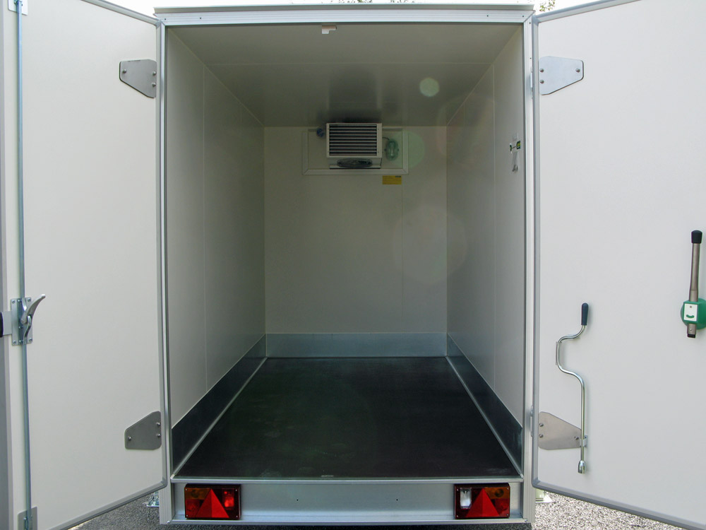 Dank der doppelflügeligen Hecktüre mit Aluminium-Scharnieren sowie einem Kühlraumpresshebelverschluss mit Edelstahl-Türfeststeller bleibt die Kühltemperatur optimal erhalten. Vier stabile Teleskopkurbelstützen garantieren einen sicheren Stand bis zu 6000 kg, während die 3-seitig umlaufende 200 mm hohe Rammschutzleiste für zusätzliche Sicherheit sorgt.