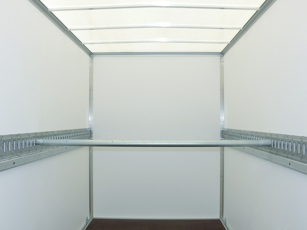 Die Wände aus GFK-Stahl-Sandwich (RAL 9016) bieten eine robuste Konstruktion: GFK außen für Beschriftung, Stahl innen für Stoßfestigkeit. Das transparente Lichtdach sorgt für optimale Sicht beim Beladen.