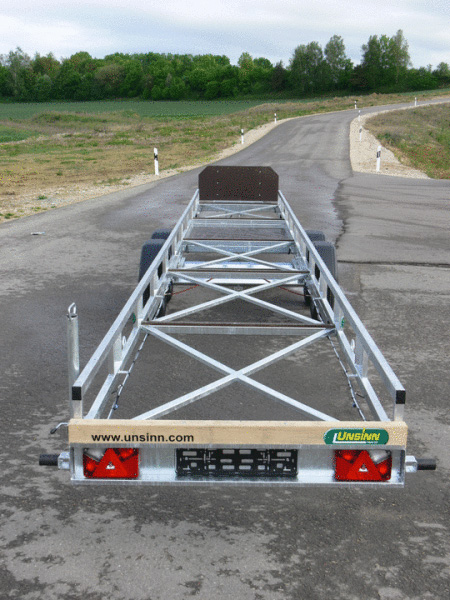 Der Unsinn UR 10513-26-14 ist ein leistungsstarker Rohranhänger mit einem verwindungssteifen Längsträgerfahrgestell, das für hervorragende Fahreigenschaften sorgt. Seine Hohlprofilkonstruktion ist verschweißt und im Tauchbad feuerverzinkt, was eine hohe Langlebigkeit garantiert. Die Ladungssicherung wird durch Verstärkungsträger mit diagonaler Befestigungsmöglichkeit für Spanngurte sowie eine zusätzliche Abstellstütze hinten optimiert. Die Ladefläche umfasst eine mittig platzierte Ablagebox mit einer Länge von ca. 2000 mm sowie Querträger mit Holzleisten. Die elektrische Ausstattung bietet eine Beleuchtung mit 13-poligem Stecker, Rückfahrscheinwerfer sowie eine Steckdose mit Zwischenkabel.