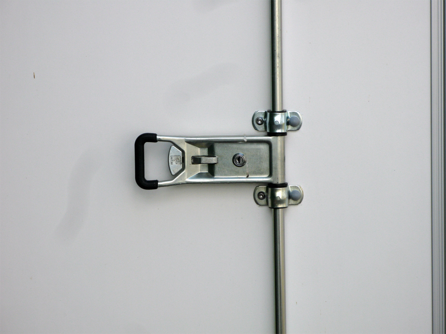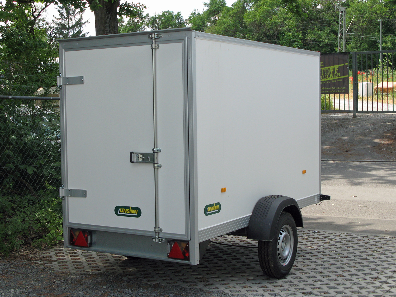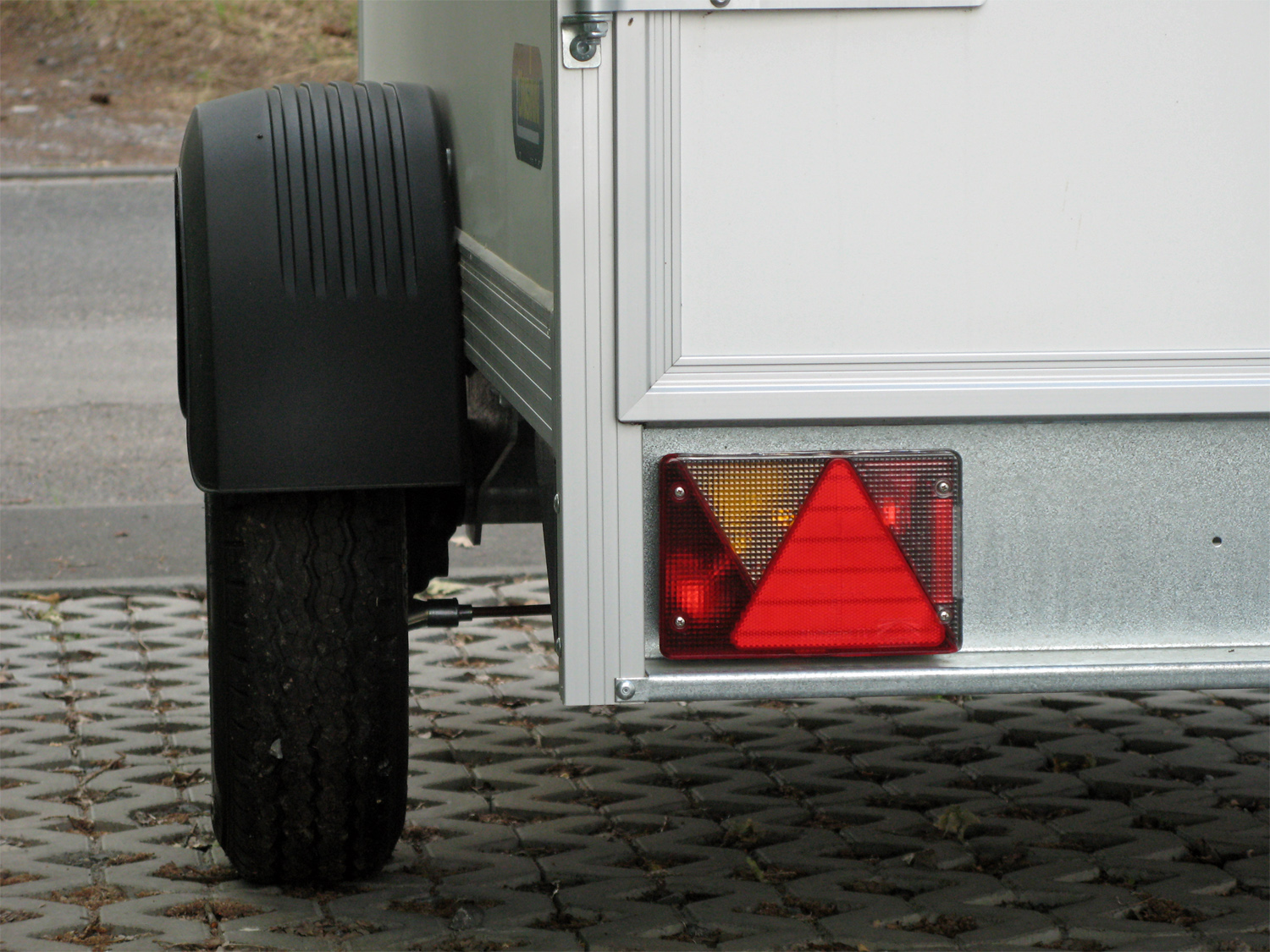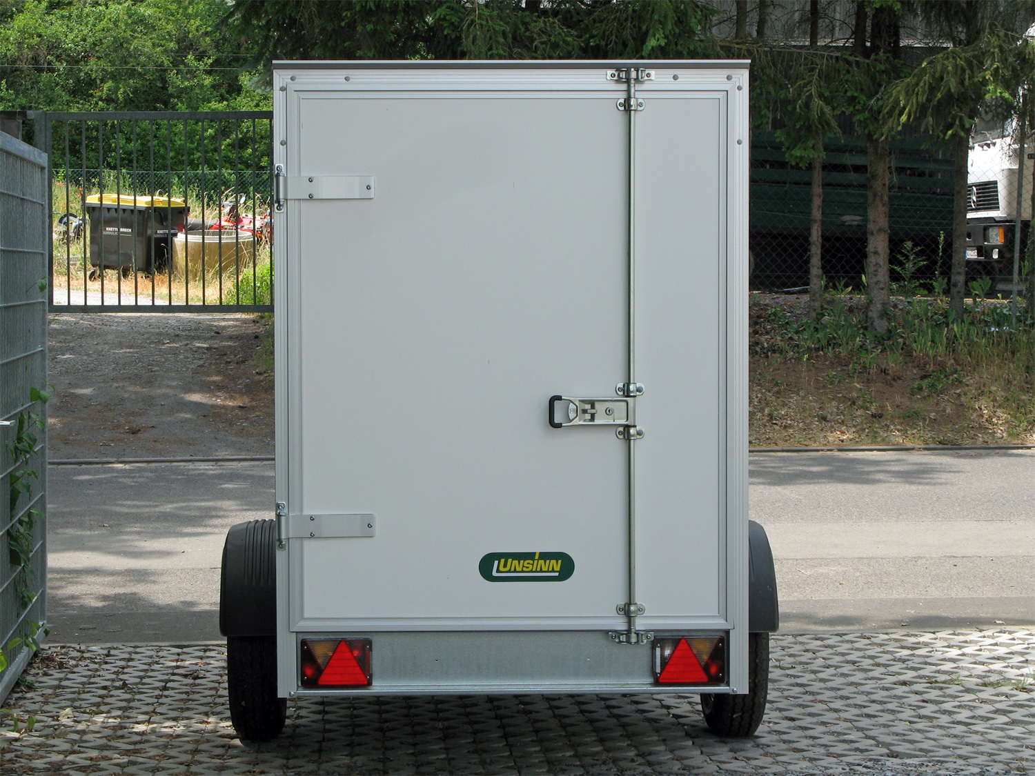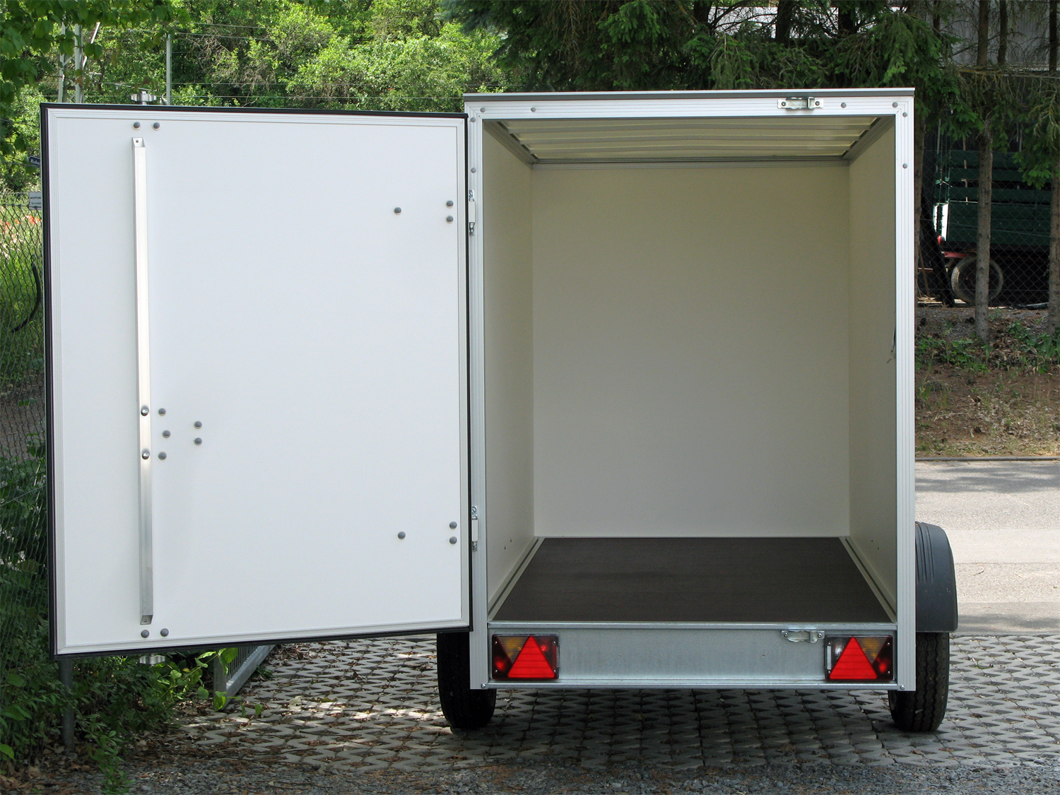 Die einflügelige Hecktüre ist mit Aluminium-Scharnieren, einem verzinkten Drehstangenverschluss und einem Edelstahl-Türfeststeller ausgestattet. Der eloxierte Heckrahmen und die Aluminium-Einfassprofile verleihen dem Anhänger ein hochwertiges und formschönes Design.