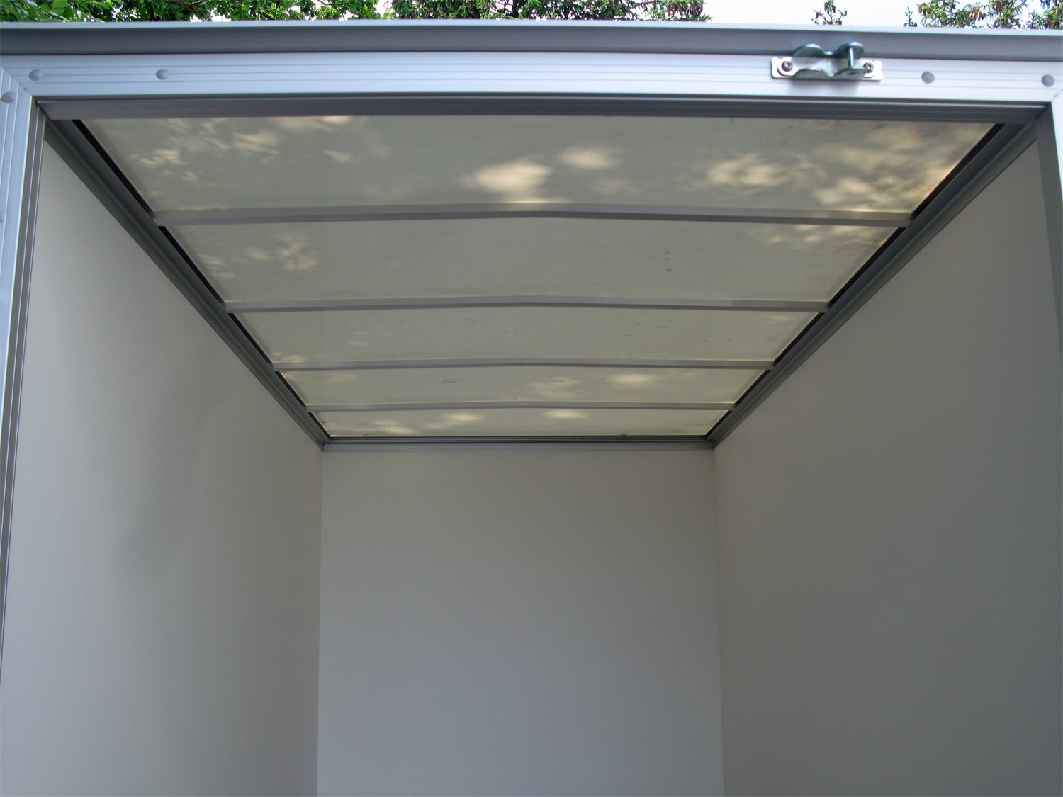 Die Plywood-Elemente mit GFK-Oberfläche (RAL 9010) bieten eine stabile Bauweise mit einer langlebigen Außenbeschichtung. Das transparente Lichtdach verbessert die Sicht beim Beladen.