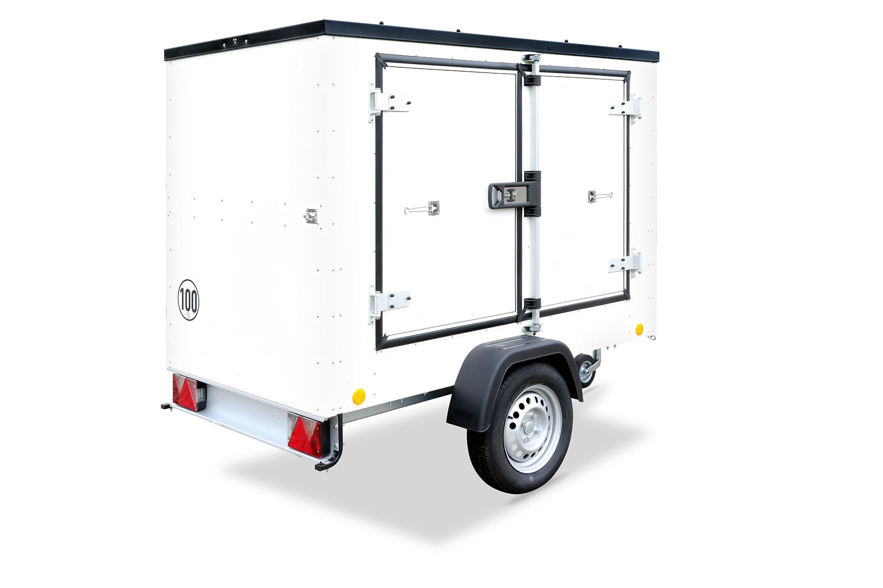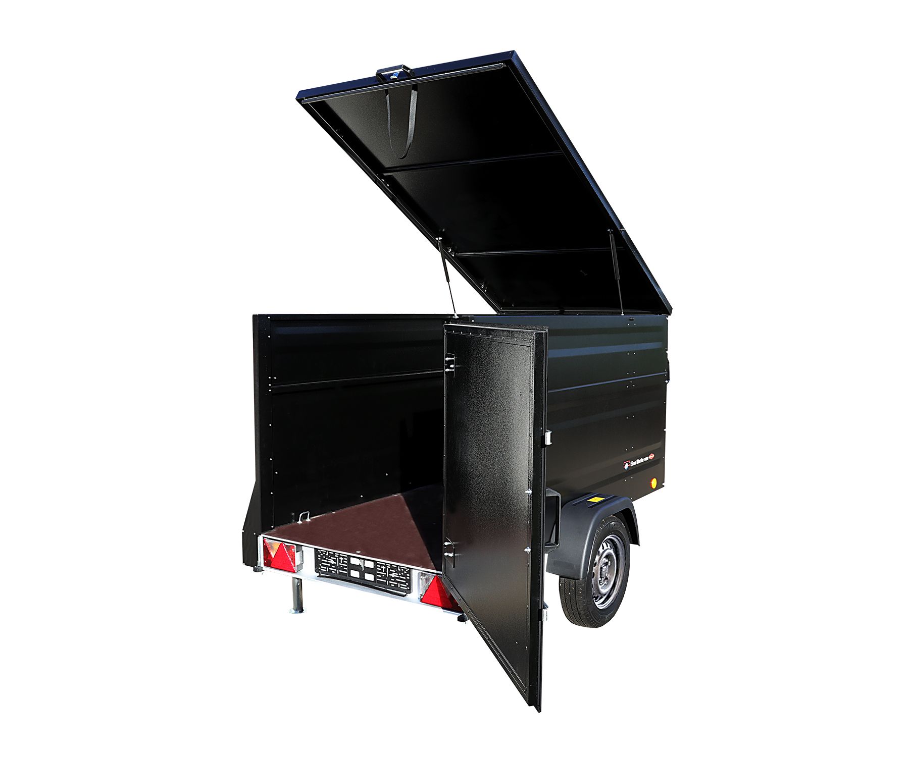 Der TPV Kofferanhänger KT-EU2 ist ein einachsiger, ungebremster Verkaufsanhänger mit einer Zulässigen Gesamtmasse von 750 kg. Die Doppelflügeltür rechts aus
